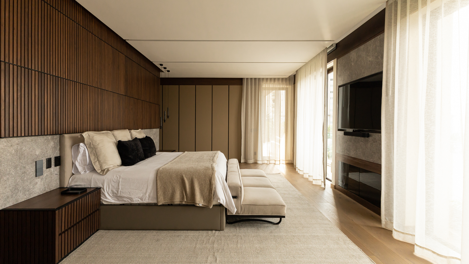 Los clósets integrados y el mobiliario empotrado prolongan líneas y amplían la lectura del interior. Madera natural y lacas mate conviven con herrajes discretos, generando una sensación de orden sin rigidez. Nada irrumpe en la composición: cada pieza cumple una función precisa y la funcionalidad misma se vuelve parte del diseño. Aquí, la precisión técnica se transforma en bienestar cotidiano.