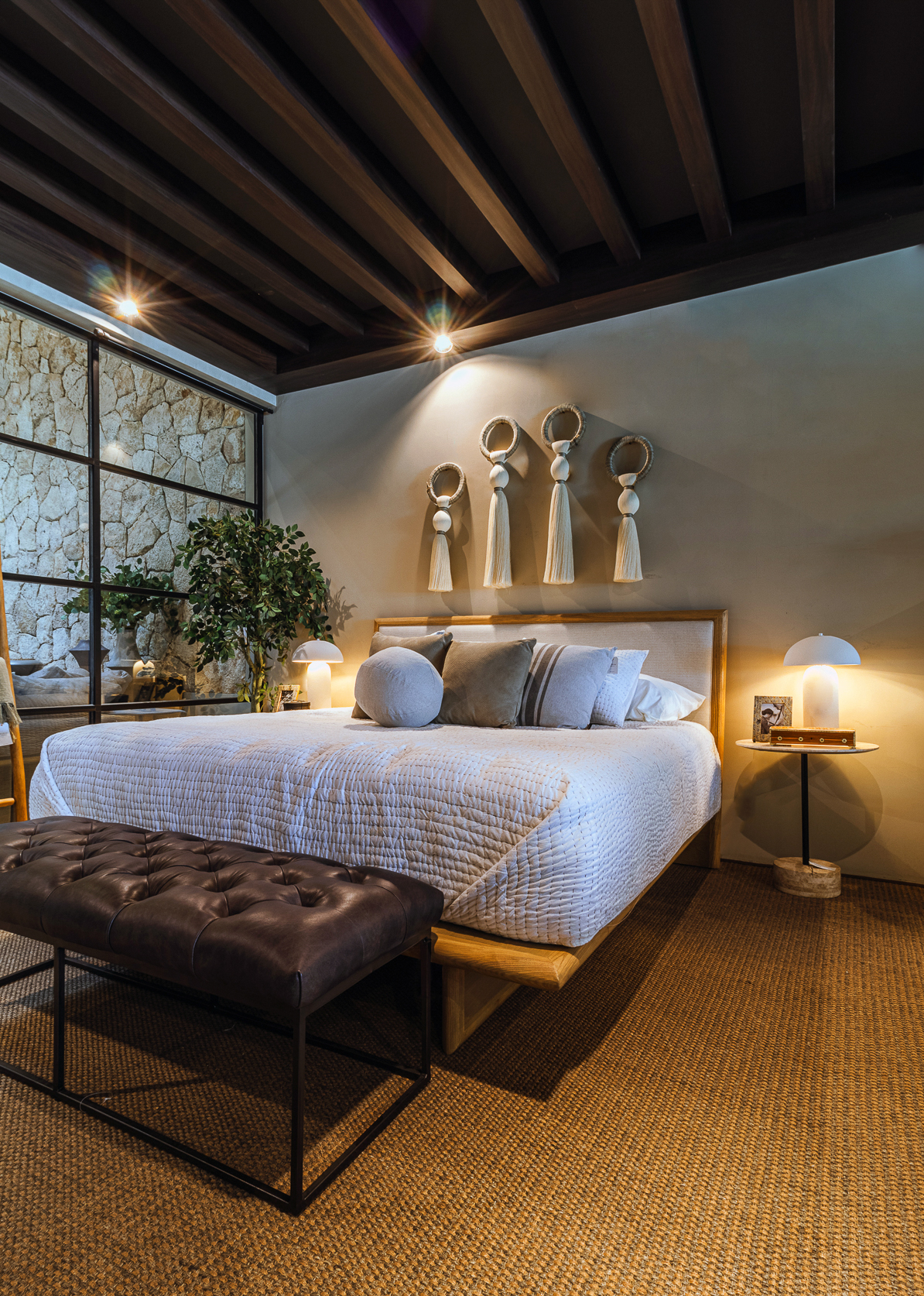 Superficies como el lino, la madera envejecida y el bronce aportan capas sensoriales que enriquecen la experiencia del descanso. La luz tamizada por las cortinas y los brillos suaves refuerzan la calidez del conjunto. Cada textura evoca calma, familiaridad y tiempo.