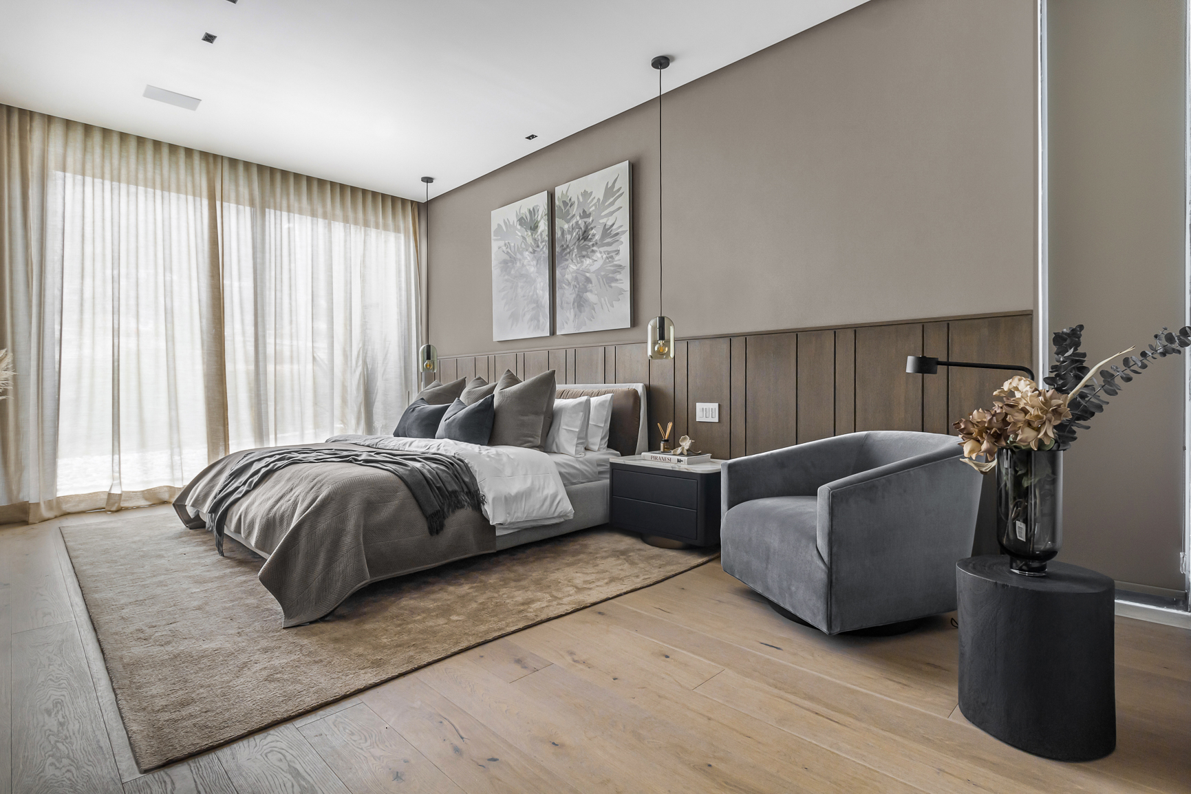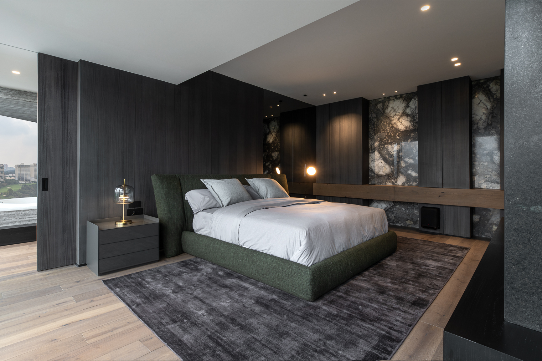 Entre líneas puras y volúmenes despejados, el orden surge de lo que no está. Una circulación fluida da claridad a la distribución y cada elemento se coloca con exactitud para mantener la calma visual. La cama, revestida en lino y alineada con el muro, actúa como ancla del espacio: un refugio que invita a la quietud.