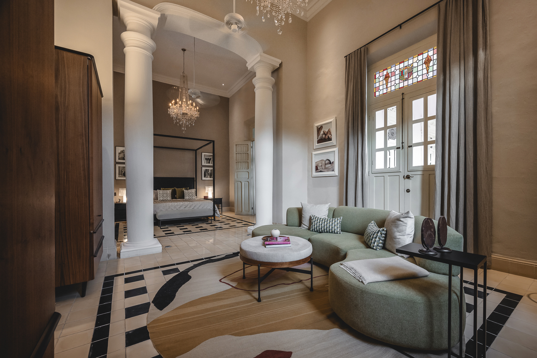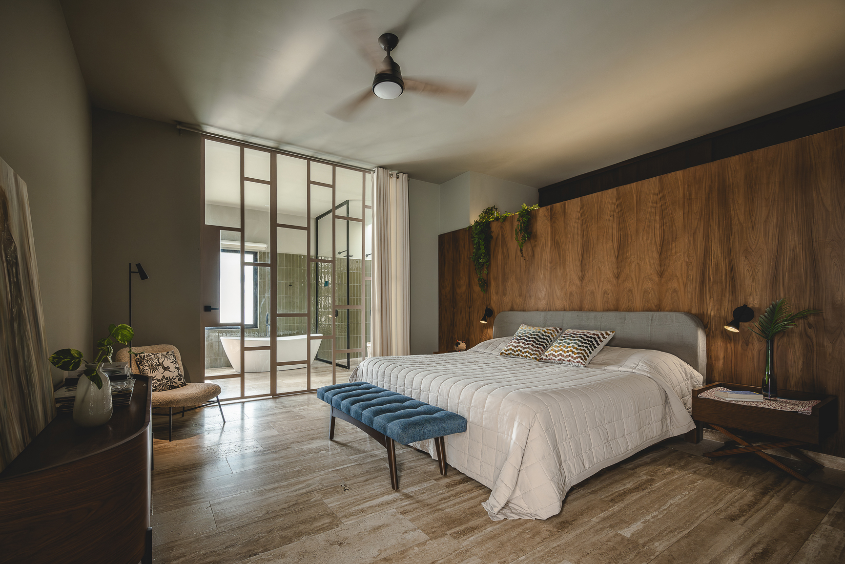 Una recámara puede equilibrar herencia arquitectónica y sensibilidad contemporánea. Muros altos, ventanales con celosías y columnas clásicas conviven con una atmósfera de serenidad creada con materiales naturales y tonos neutros. El piso en damero marca ritmo; la cama de estructura metálica organiza la composición. Mobiliario de líneas limpias, textiles suaves y arte seleccionado con intención construyen un ambiente íntimo y sofisticado, donde cada elemento parece narrar permanencia.