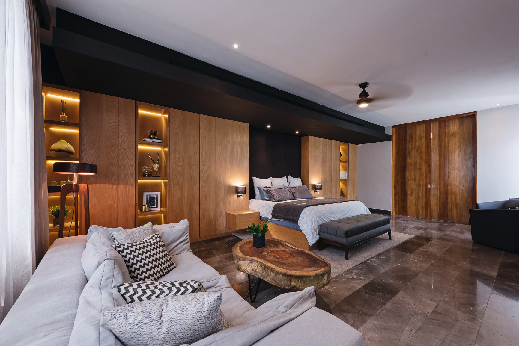 Cuando la recámara se abre hacia una pequeña sala, ambas zonas dialogan de forma natural. Telas en tonos neutros y superficies de madera aportan una sensación táctil envolvente, mientras los espejos —ubicados con intención— multiplican la profundidad sin interrumpir el orden visual. Es un espacio diseñado para moverse con calma.