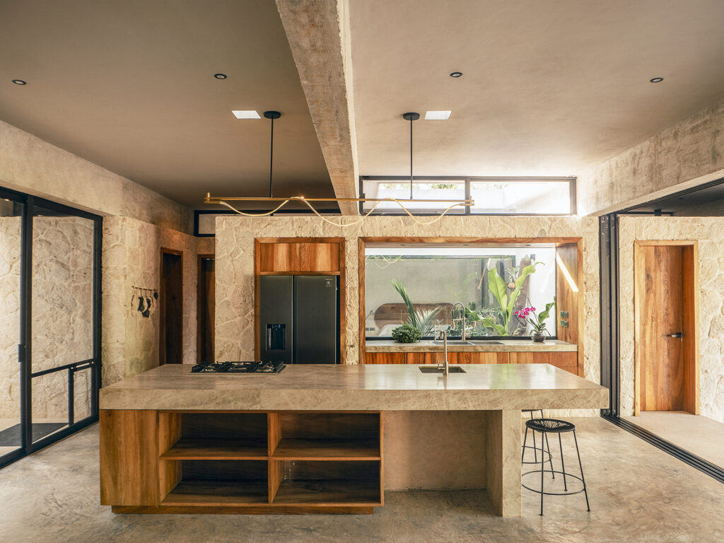 El dúo concreto-madera es ideal para cocinas con carácter relajado. Usa concreto para dar estructura y un aire industrial, y suavízalo con maderas claras como roble o nogal. Sustituye alacenas cerradas por repisas de microcemento que dejen la vajilla a la vista como parte del diseño. Completa con sillas tejidas que aporten textura ligera y un toque artesanal. Una mezcla ideal para casas donde la estética se disfruta con calma.