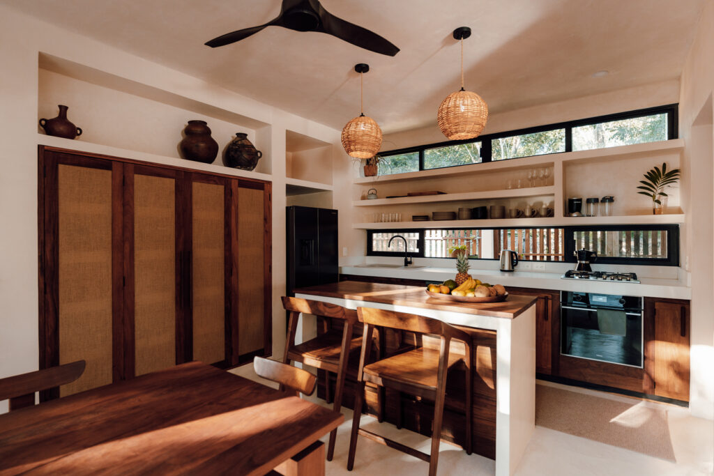 Para que una cocina vacacional se sienta viva, intégrala con alma y coherencia. Opta por electrodomésticos ocultos o empotrados que se fundan con el mobiliario. Acentúa con elementos naturales: lámparas de barro, canastas de mimbre y arte en tonos tierra. Agrega vegetación útil, como un pequeño huerto o plantas secas que sumen textura y carácter. Completa el ambiente con sillas que armonicen con la paleta general y cortinas ligeras que tamicen la luz. Resultado: una cocina que se habita, se disfruta y se siente.