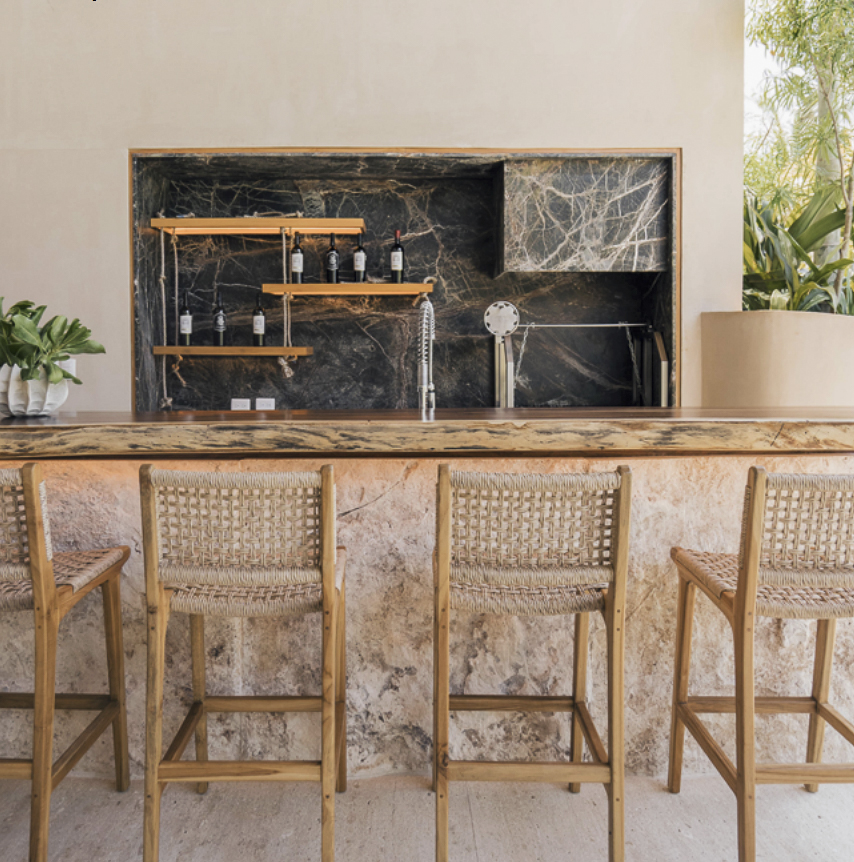 Una terraza con bar es el complemento perfecto para una cocina de descanso. Elige un material protagonista, como el mármol Rain Forest Green, y úsalo tanto en la barra frontal como en el fondo para dar cohesión. Combina con madera tropical —como tzalam, ideal para exteriores—, lámparas tejidas y estanterías con iluminación para crear un ambiente relajado y con estilo. Añade macetas y sogas decorativas para reforzar el aire natural. Un espacio pensado para compartir, brindar y dejar que la brisa haga el resto.