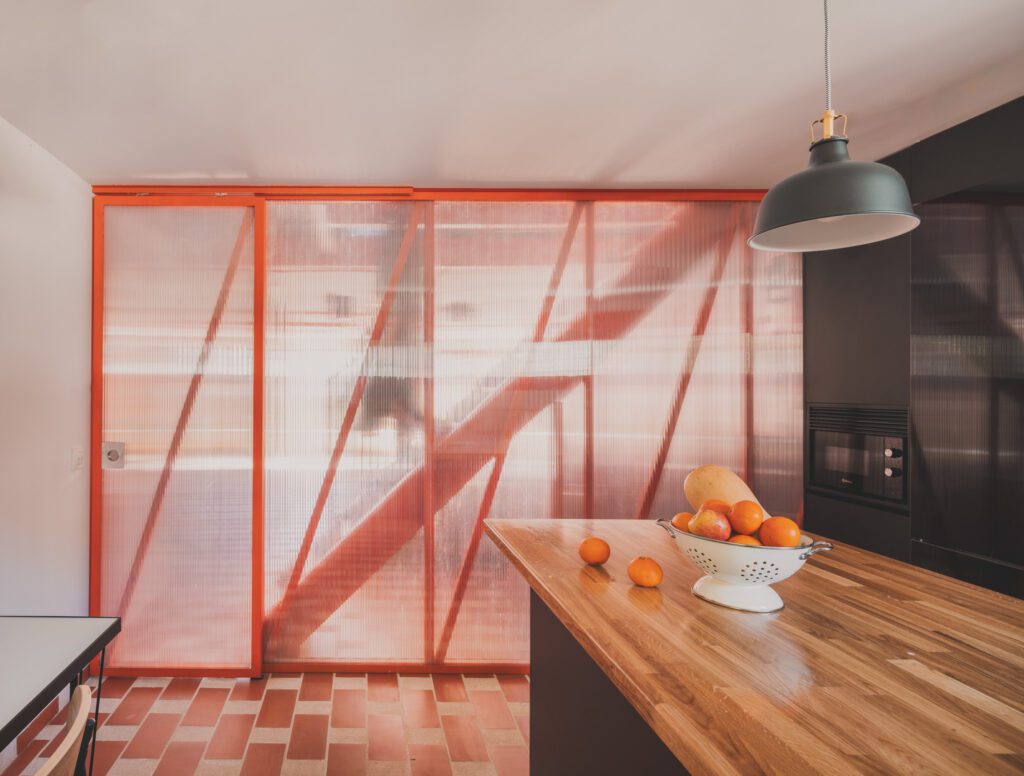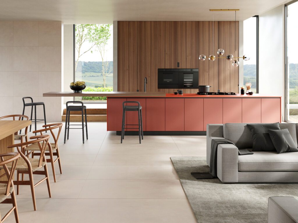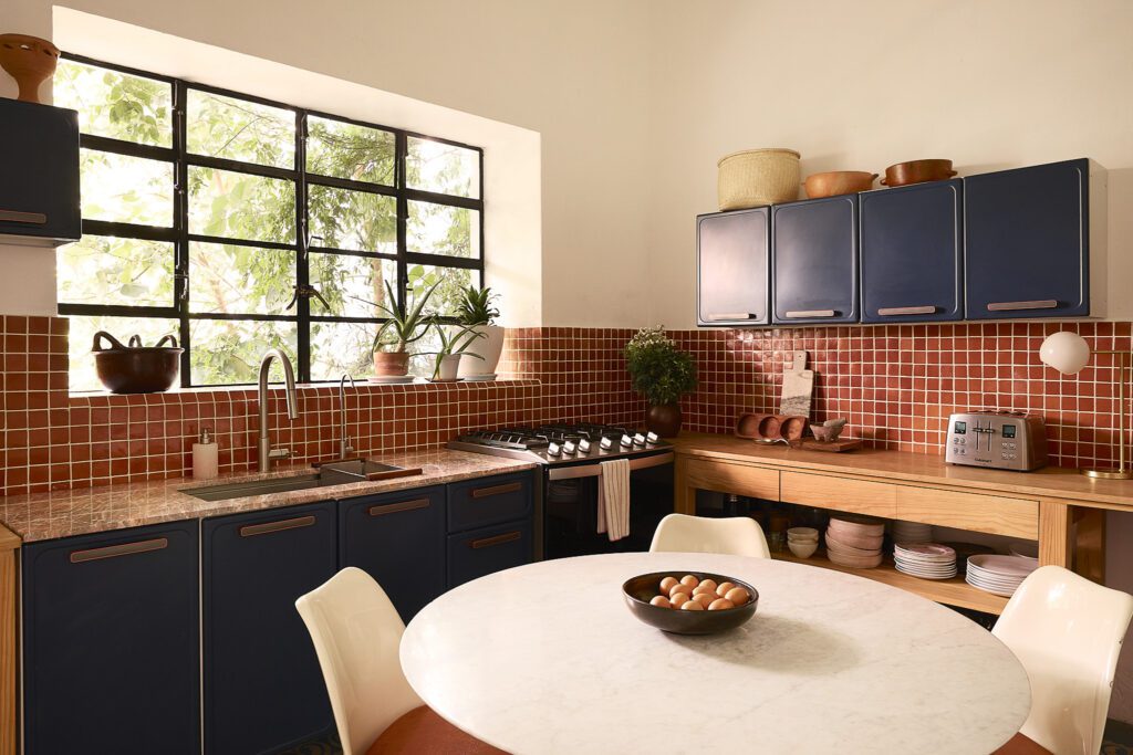 Cuando el color aparece en azulejos, frentes o gavetas, deja de ser acento para convertirse en base compositiva. Tonos cálidos como terracotas, rojos contenidos o naranjas activan el espacio desde lo permanente, aportando energía sin necesidad de añadir múltiples elementos decorativos.