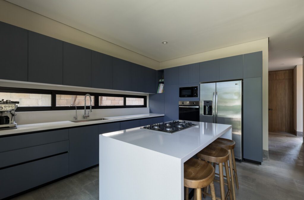 El azul funciona como un estabilizador dentro de composiciones contemporáneas. Aplicado en gabinetes o muros principales, ordena la percepción, refresca zonas de trabajo y distribuye mejor la luz natural, especialmente en cocinas lineales o profundas.