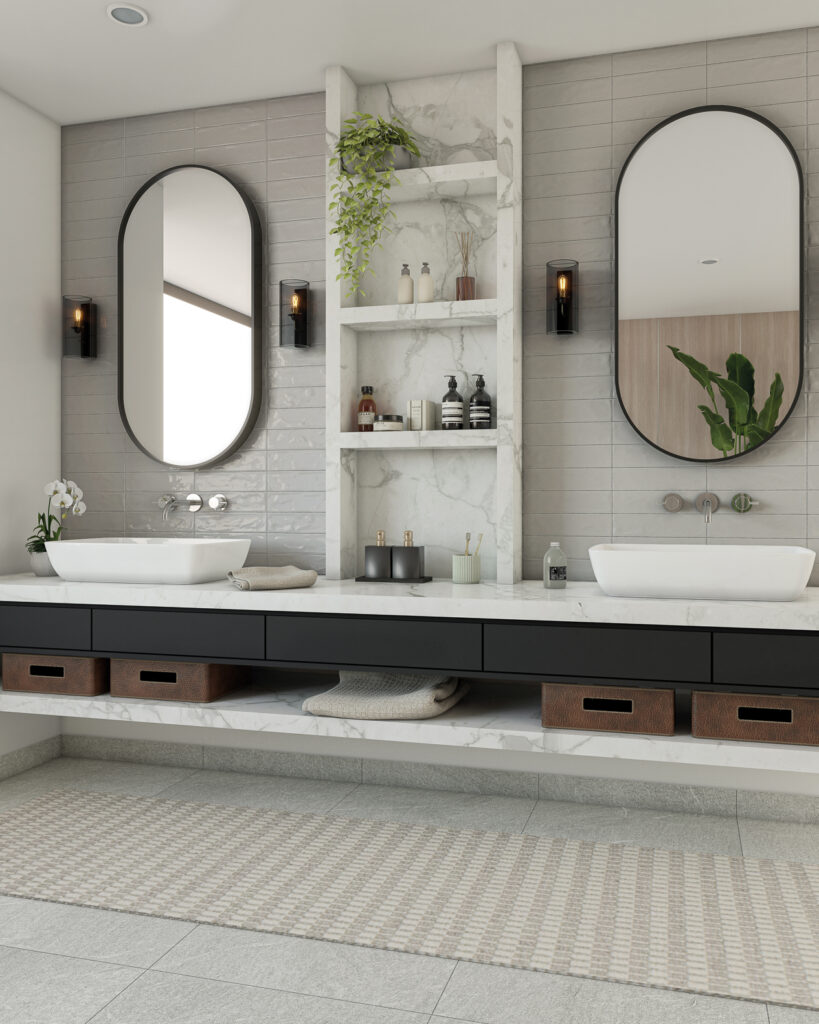 Recubrimientos oscuros, combinados con gran espejos retroiluminados y paneles de ducha transparentes, crean sensación de amplitud y elevan la elegancia del espacio. Los contrastes cromáticos y los detalles de uso cotidiano aportan carácter, haciendo que un baño compacto se sienta cuidado y sofisticado.