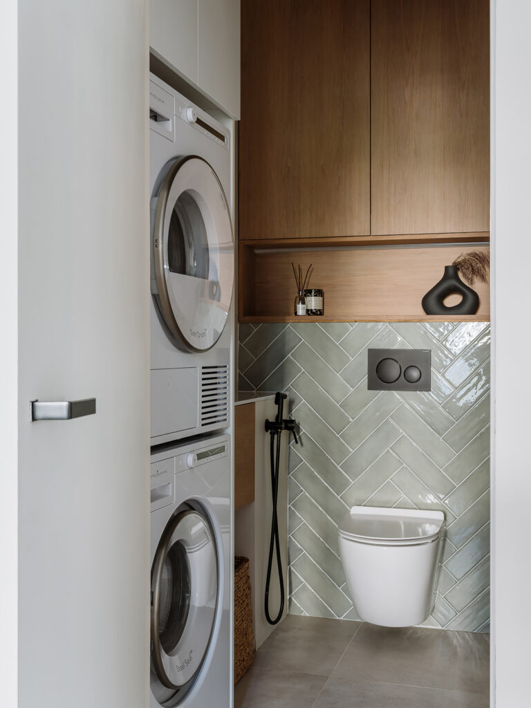 Incluso en espacios pequeños, un baño puede ser multifuncional: integrar lavadora y secadora, grifería empotrada y mobiliario suspendido permite mantener orden, limpieza visual y practicidad. La combinación de distintos recubrimientos —claros, efecto madera y acabados brillantes— genera contraste y profundidad sin saturar, logrando un ambiente contemporáneo y eficiente.