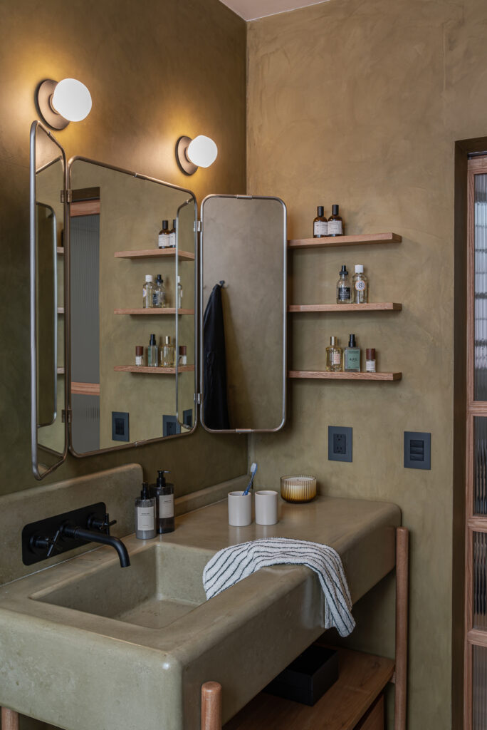 Integrar texturas naturales y contrastes —como muros rugosos frente a superficies lisas de mobiliario y cristales— aporta calidez y sofisticación. Piezas como muebles terracota, banquetas de terrazo o puertas con colores vibrantes introducen acentos sofisticados. El papel tapiz resistente a la humedad y los accesorios cuidadosamente seleccionados completan la composición, convirtiendo el baño en un espacio único y con carácter.