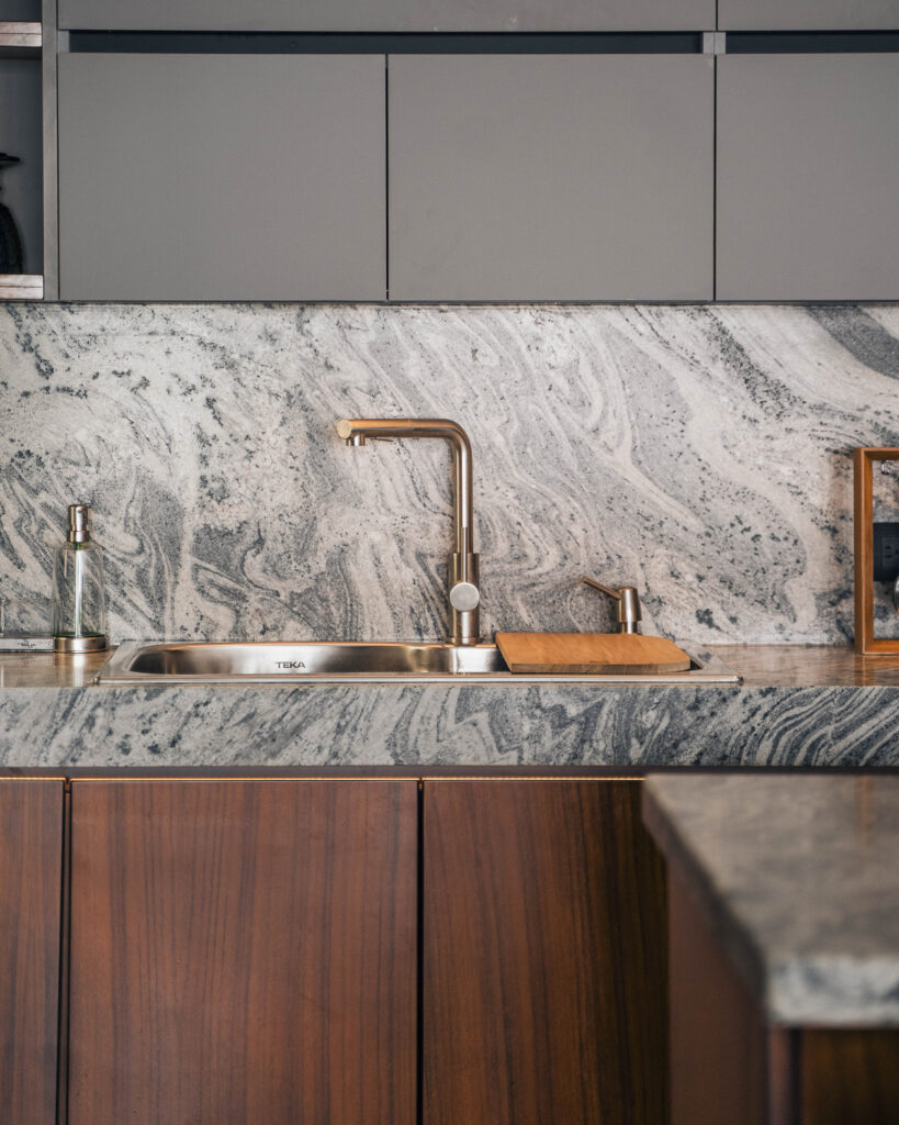 La paleta de tonos neutros, combinada con acentos en negro o dorado, genera sofisticación y profundidad. Recubrimientos veteados, madera clara y módulos abiertos permiten exhibir objetos y plantas, creando puntos focales que enriquecen la percepción de amplitud y carácter.