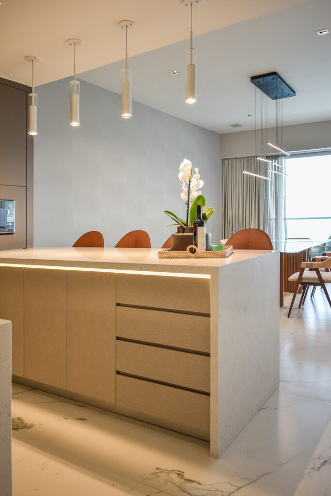 La iluminación inteligente es clave: luz intensa para cocinar, luz cálida y tenue para convivir. Combinada con estantes superiores claros y luminarias discretas, potencia la verticalidad, resalta los detalles de diseño y hace que la cocina se perciba más amplia y eficiente.