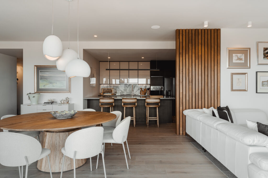 Conectar la cocina con comedor y sala genera un flujo continuo y favorece la convivencia. Celosías ligeras delimitan ambientes sin restar amplitud, y el diseño lineal de muebles mantiene funcionalidad y coherencia estética. Una mesa de comedor bien ubicada puede incluso sustituir a una isla, optimizando el espacio disponible.