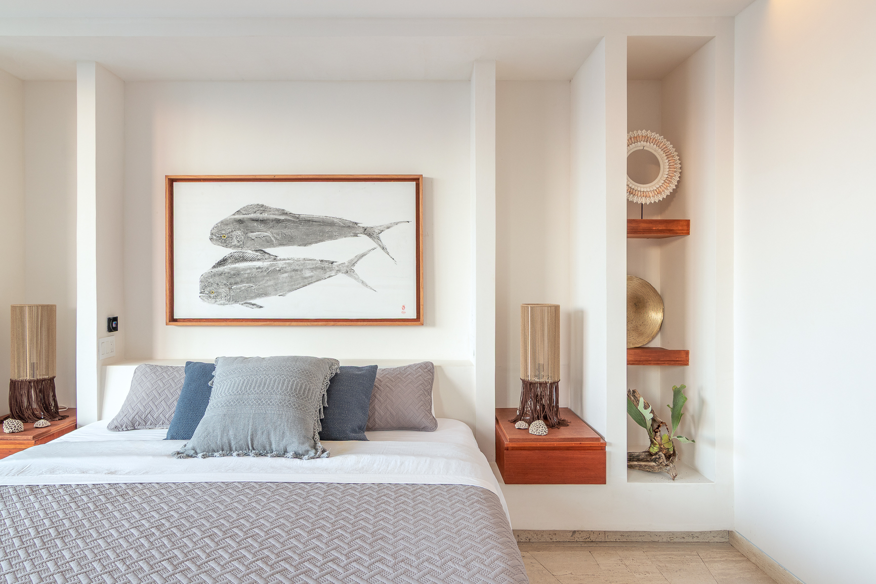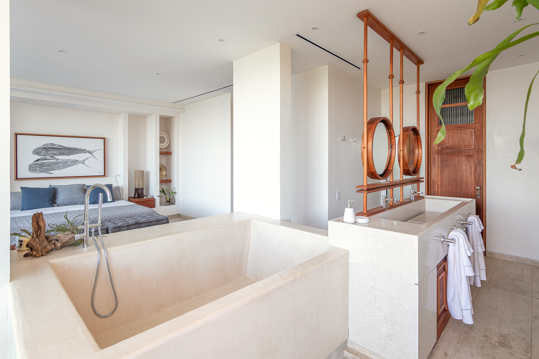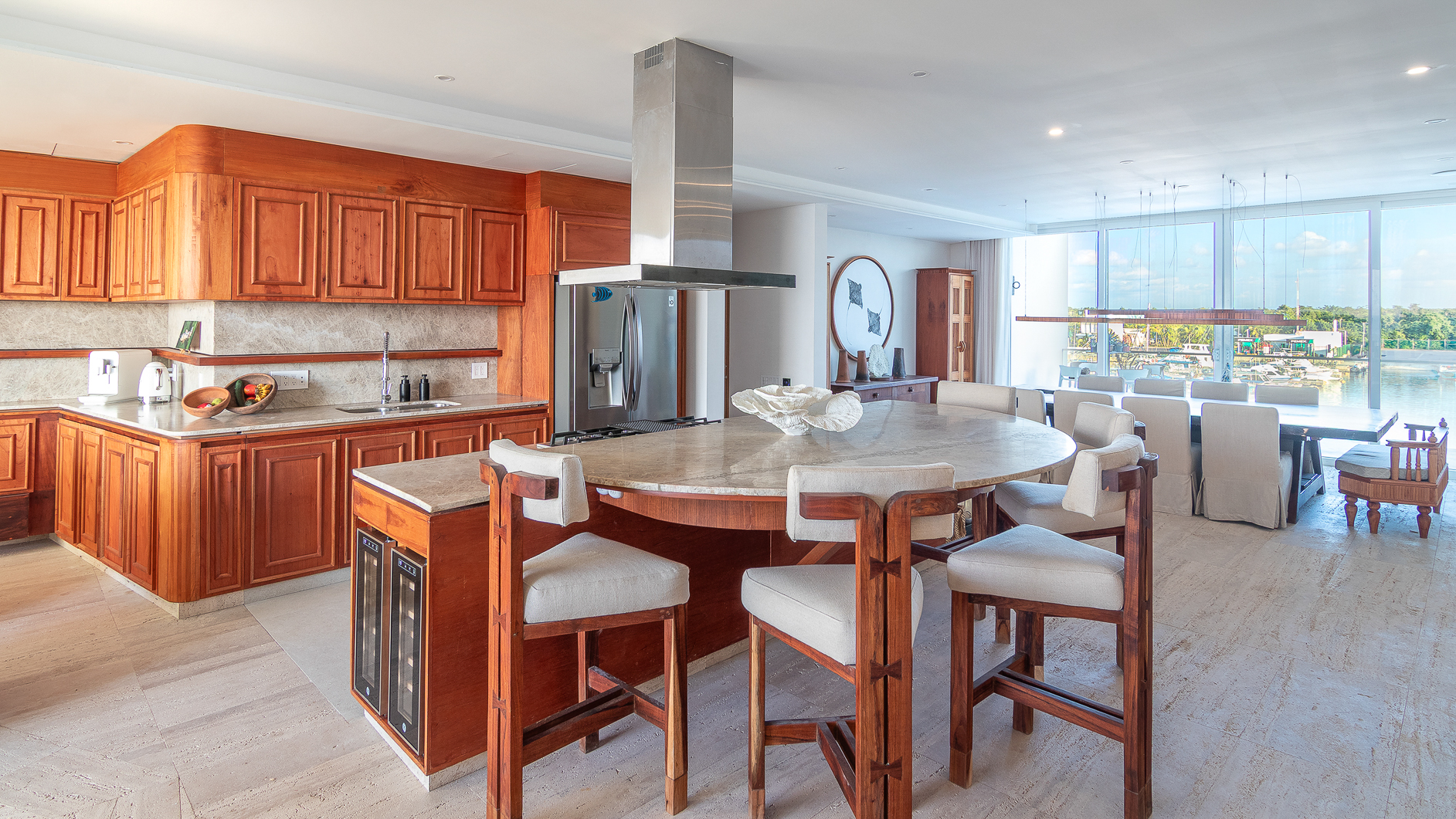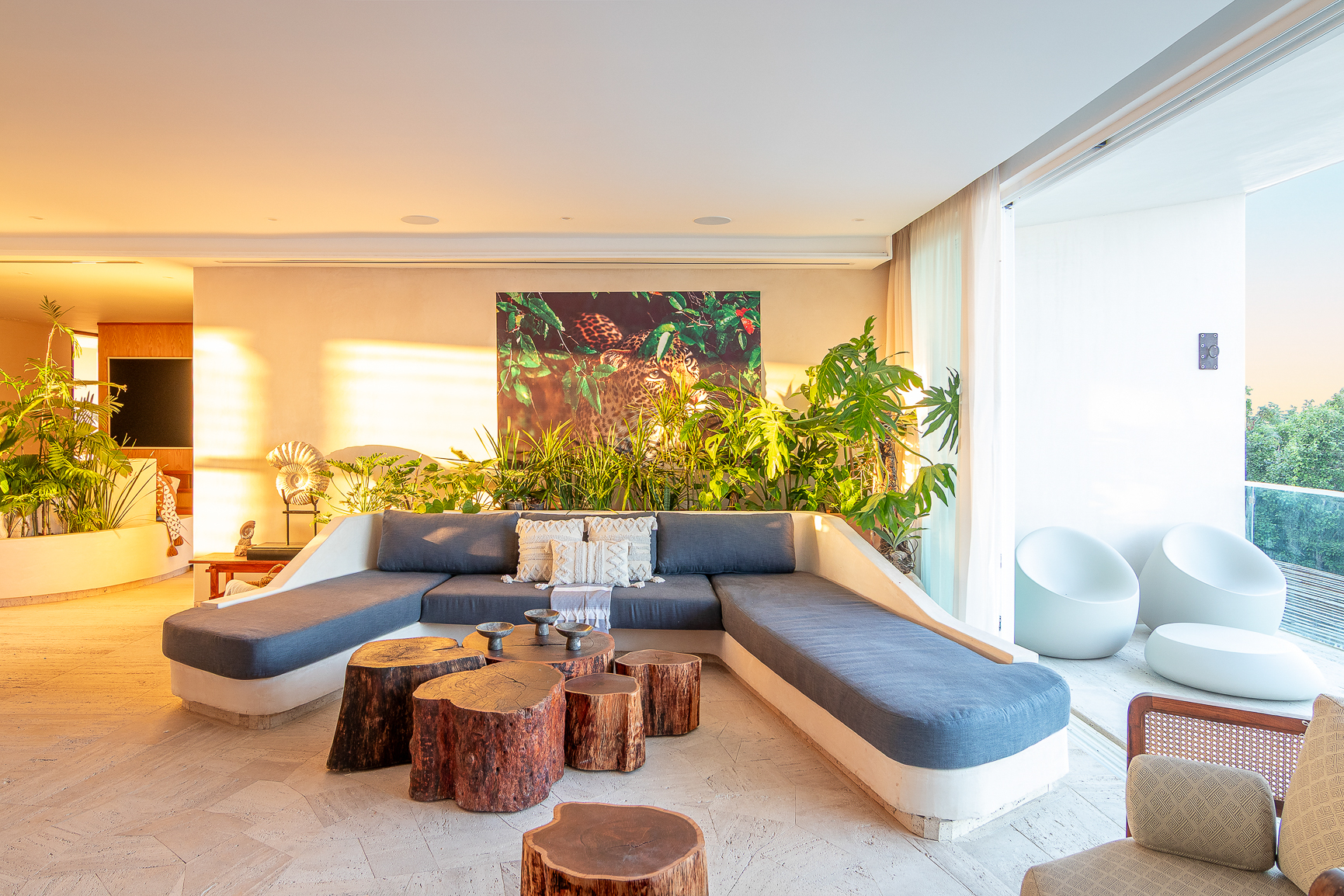 El acceso revela el corazón de la casa: cocina y family room en torno a un jardín interior que funciona como un pequeño Edén. La estancia, abierta al Caribe, combina un sofá inspirado en el lenguaje náutico con sillones que reinterpretan grecas mayas y piezas talladas en zapote y parota recuperada. Una fotografía de gran formato —un leopardo, obra del propietario— dialoga simbólicamente con el imaginario del jaguar yucateco.