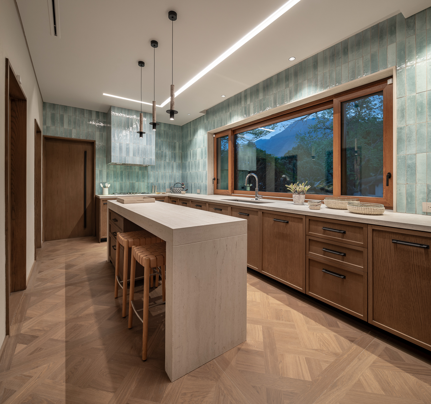 Entre los principales retos se encontraban la sala y el comedor divididos por un desnivel que limitaba su uso, un acceso principal fragmentado por un muro de adobe y herrería, una cocina pequeña y oscura, junto con una escalera estrecha e incómoda. La intervención inició con la ampliación de la cocina, que integró el área de lavandería y se generó un espacio más grande y luminoso mediante una ventana que conecta directamente con el jardín. Los azulejos artesanales en tono azul cielo aportan frescura y una sensación de limpieza visual. La escalera —antes un elemento de servicio hacia la cochera— fue modificada estructuralmente para transformarse en una pieza amplia y rectilínea, acompañada por una nueva ventana que inunda de luz el recorrido. Del muro de remate emergen y ascienden hacia el plafón largas luminarias que crean un efecto escultórico.