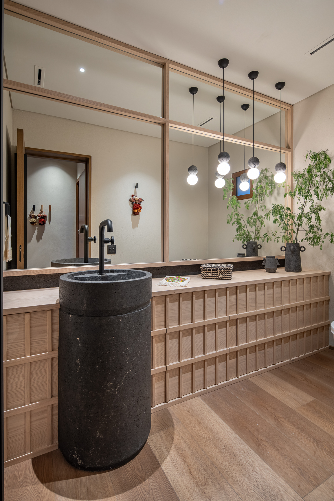 En el baño principal, la cliente deseaba un lavabo con vistas hacia la sierra y el jardín; por ese motivo, se abrió una ventana equipada con película inteligente eléctrica que permite controlar la privacidad con un solo toque. En su conjunto, la casa de campo Barro celebra la artesanía, la materialidad y la serenidad del paisaje regiomontano. Tradición y contemporaneidad conviven en equilibrio, dando forma a un refugio donde la luz y la calidez se convierten en lenguaje de diseño.