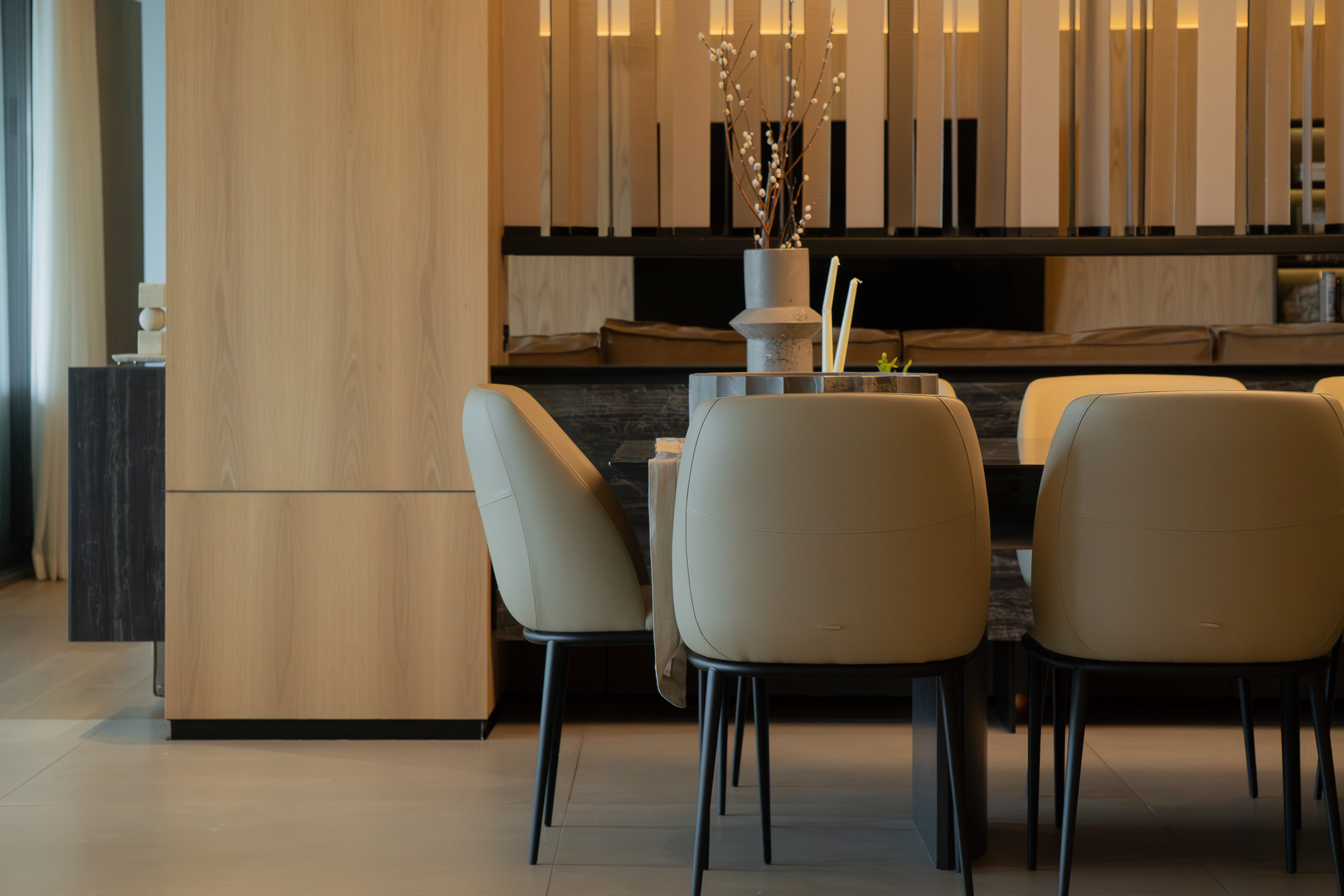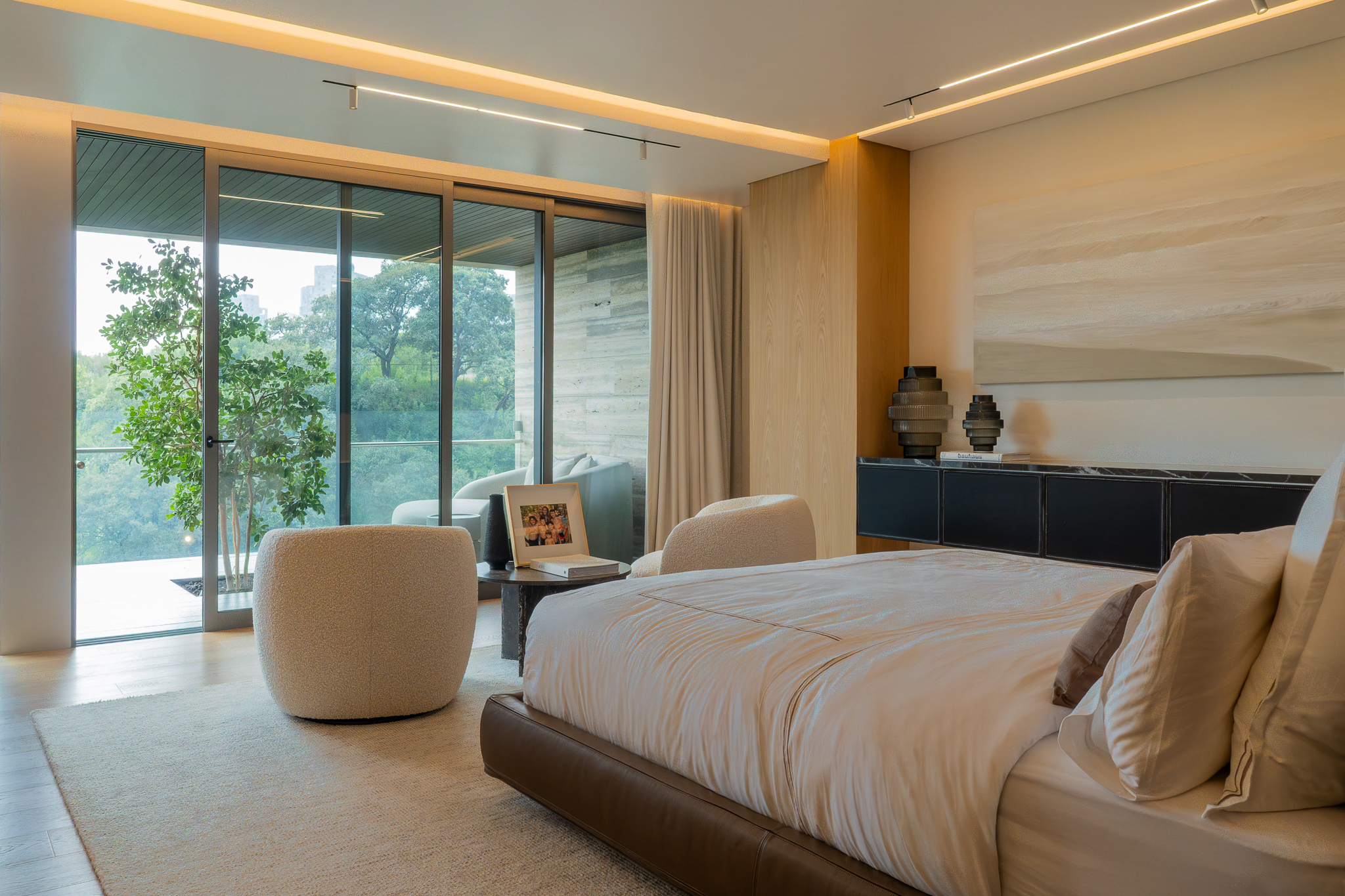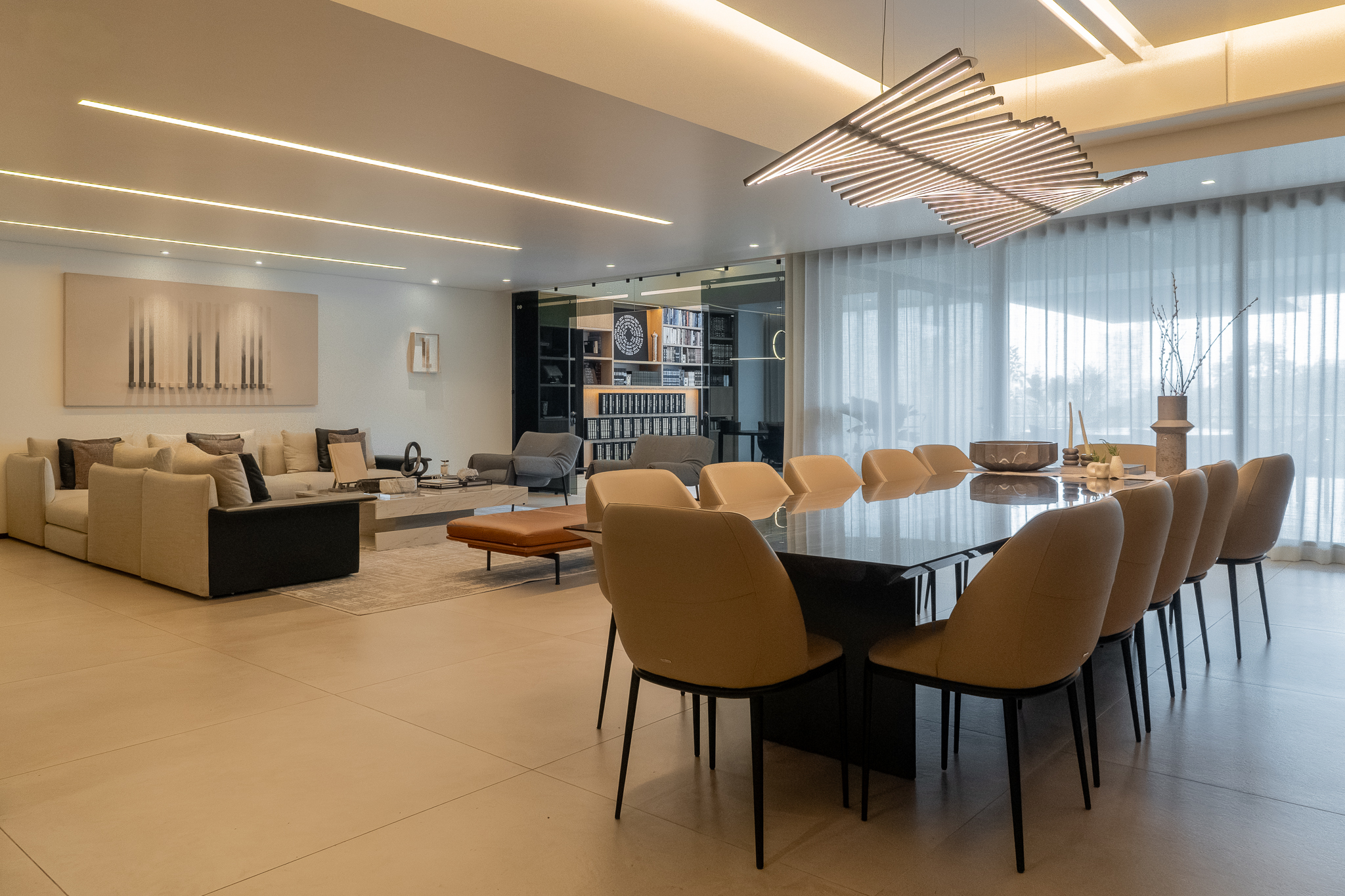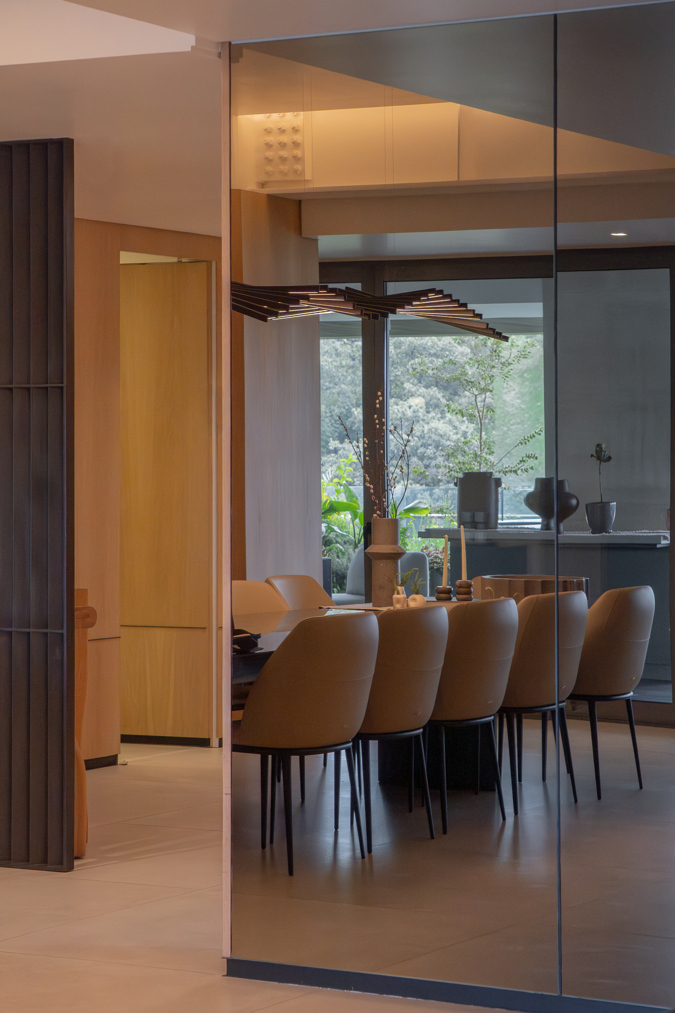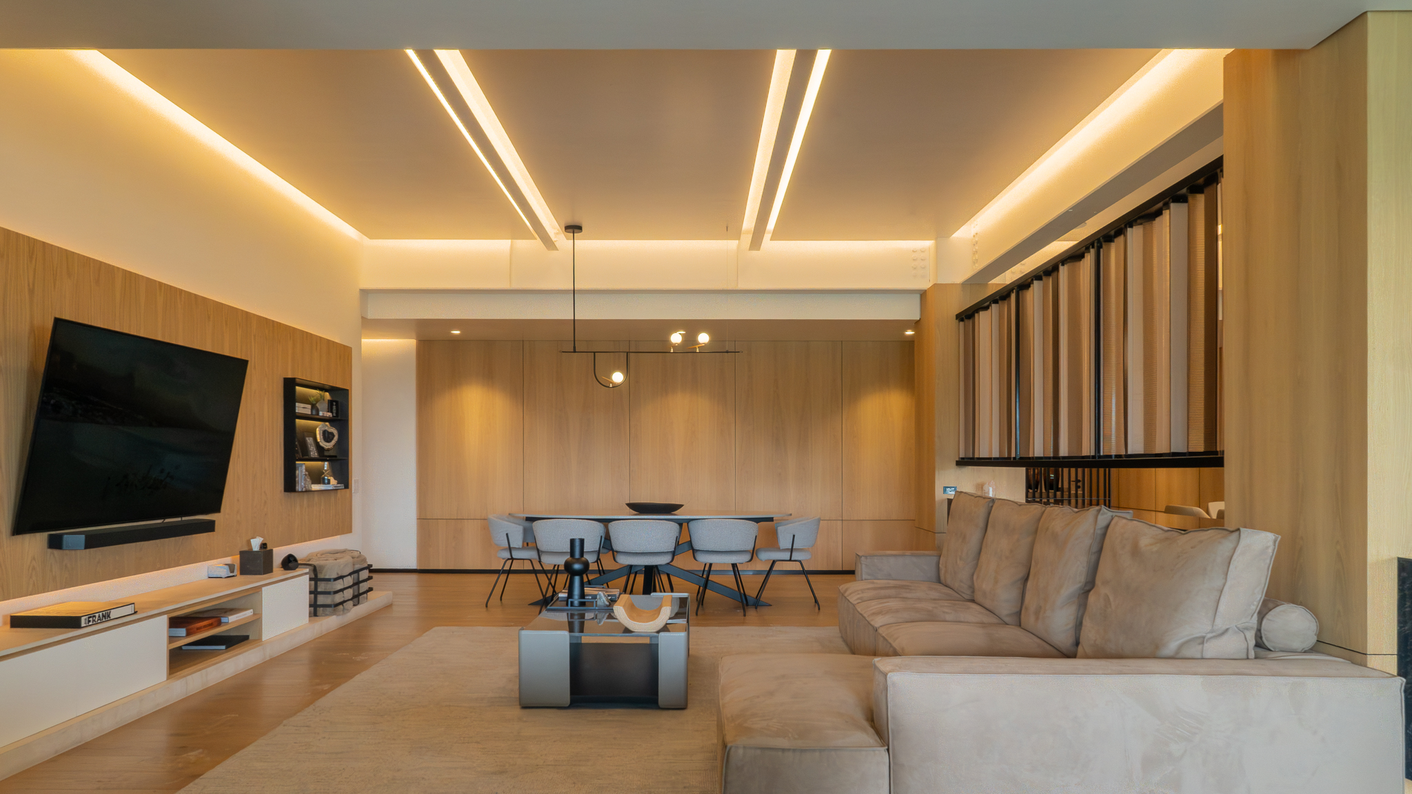 Como elemento funcional y expresivo, el mobiliario se integró a la arquitectura. Destacan la estación de café oculta tras un lambrín de espejo en la sala y un mueble escultórico que funciona como bufetera en el comedor y remate visual desde el área familiar. Las vigas estructurales existentes se aprovecharon para implementar iluminación indirecta que amplía y enmarca los espacios, mientras la selección de obra artística dialoga con la geometría del mobiliario y los elementos arquitectónicos.