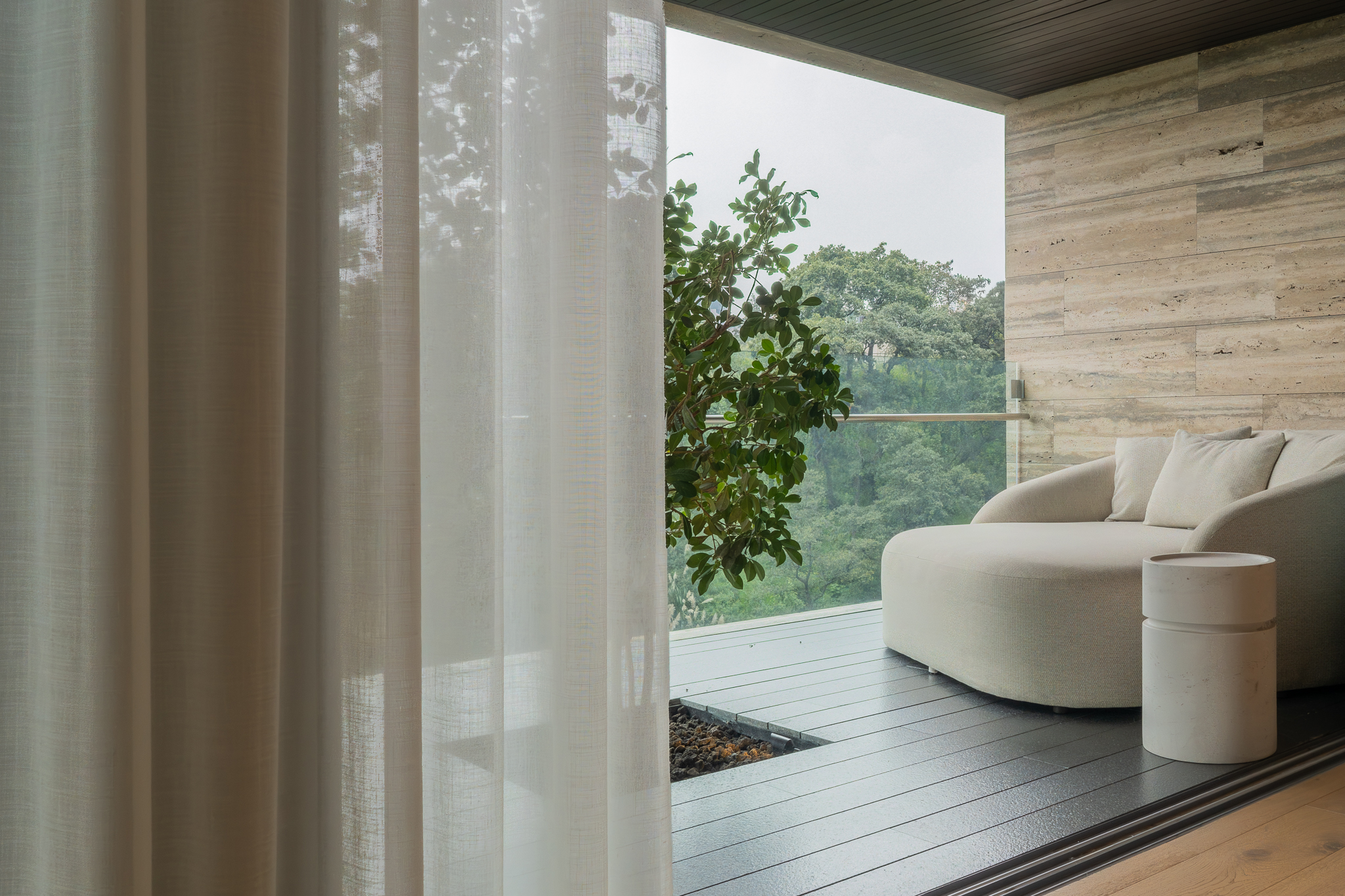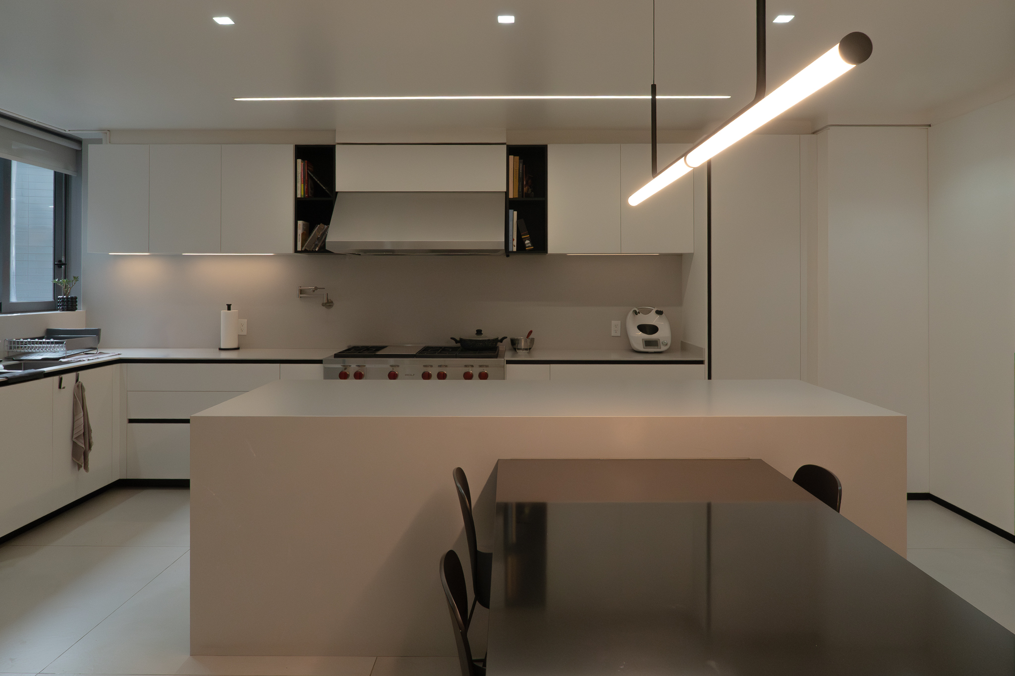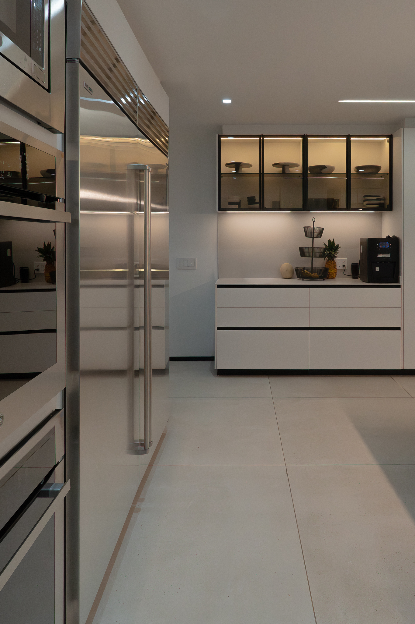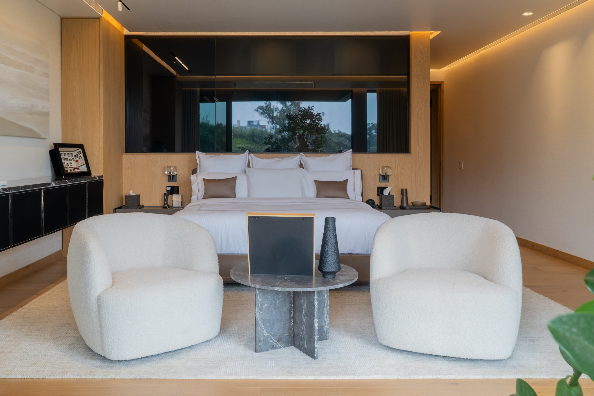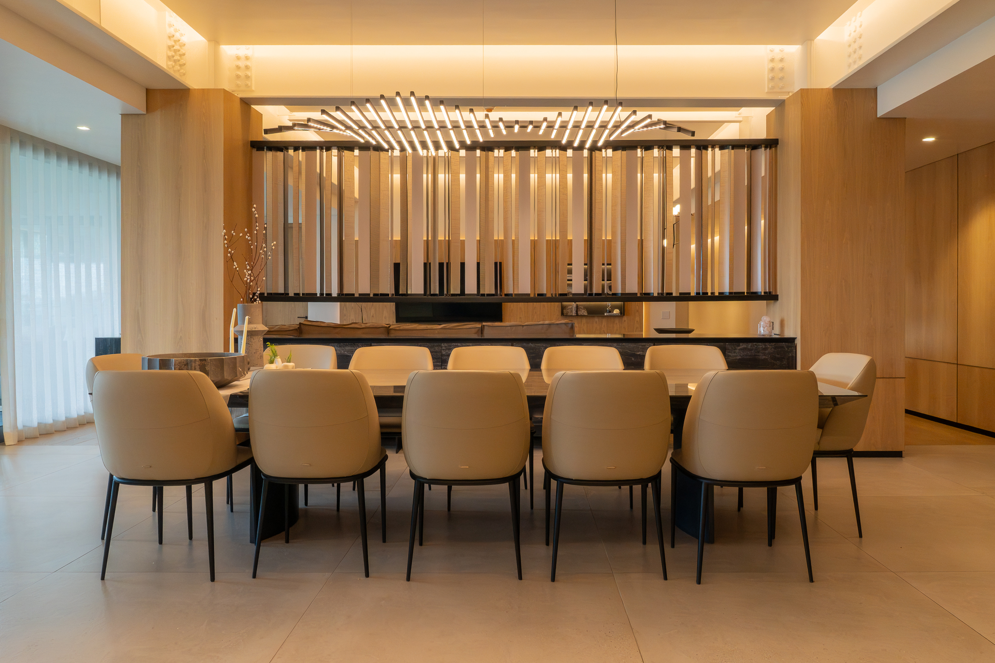 Como elemento funcional y expresivo, el mobiliario se integró a la arquitectura. Destacan la estación de café oculta tras un lambrín de espejo en la sala y un mueble escultórico que funciona como bufetera en el comedor y remate visual desde el área familiar. Las vigas estructurales existentes se aprovecharon para implementar iluminación indirecta que amplía y enmarca los espacios, mientras la selección de obra artística dialoga con la geometría del mobiliario y los elementos arquitectónicos.