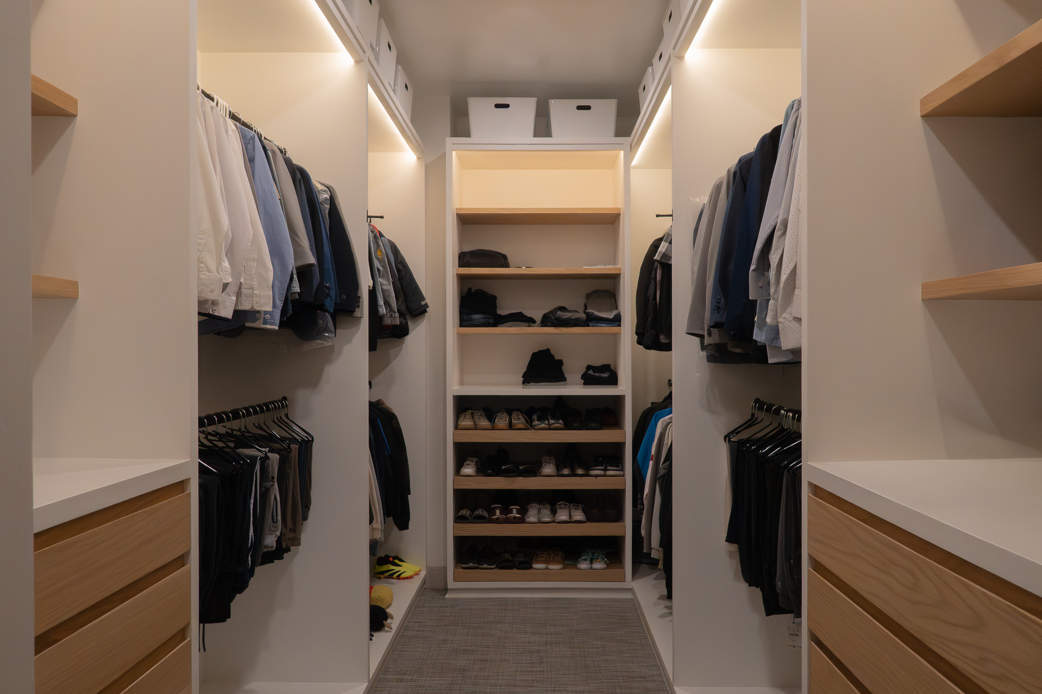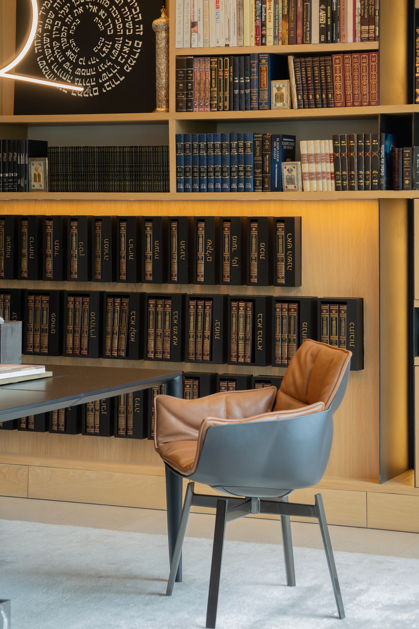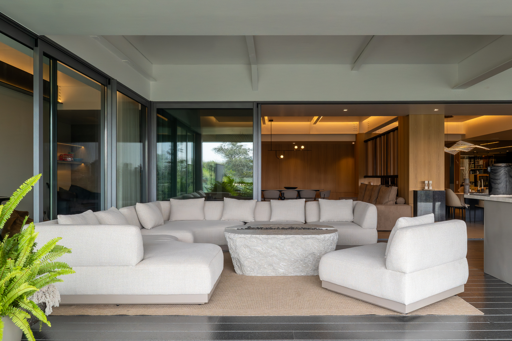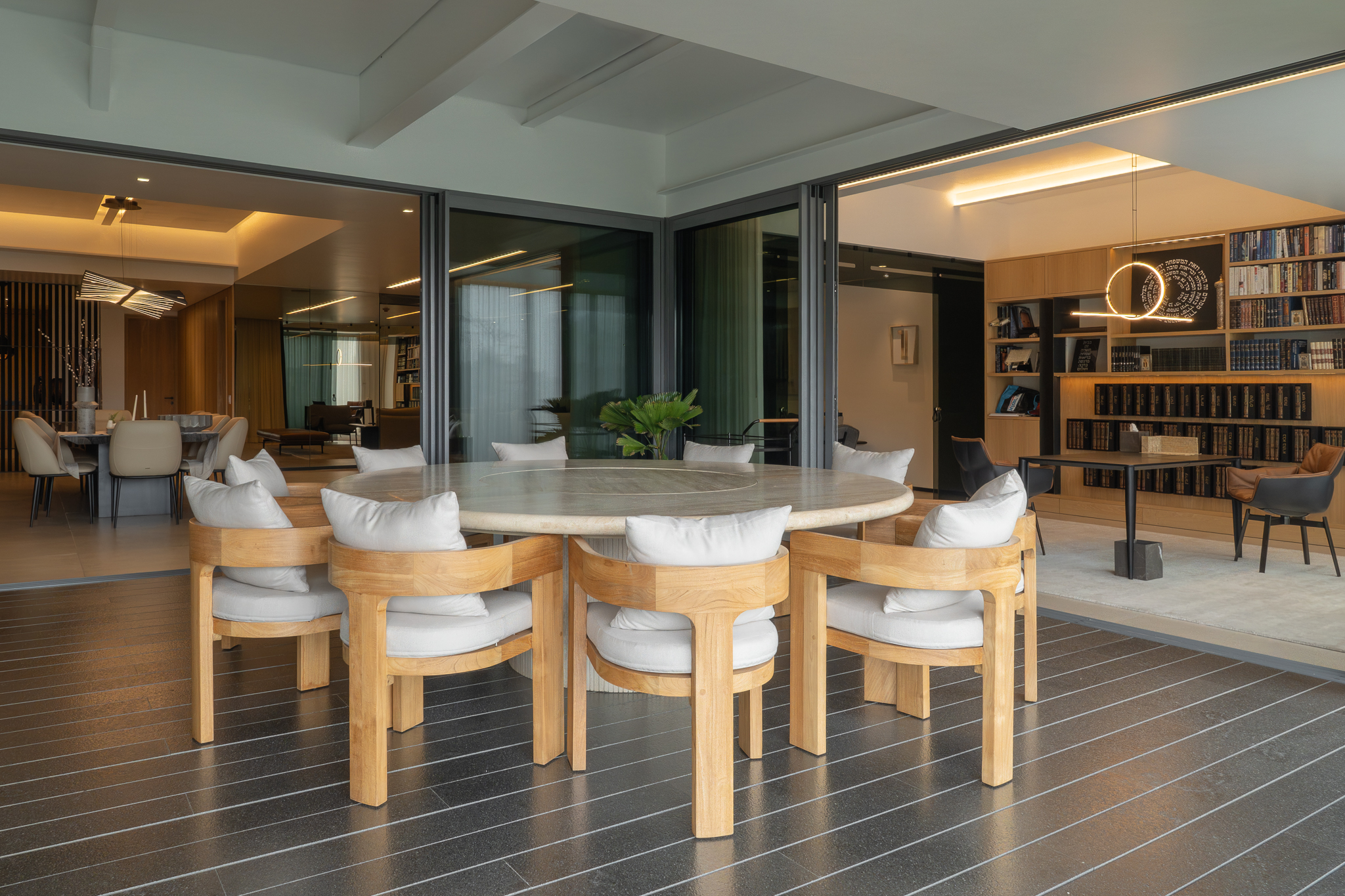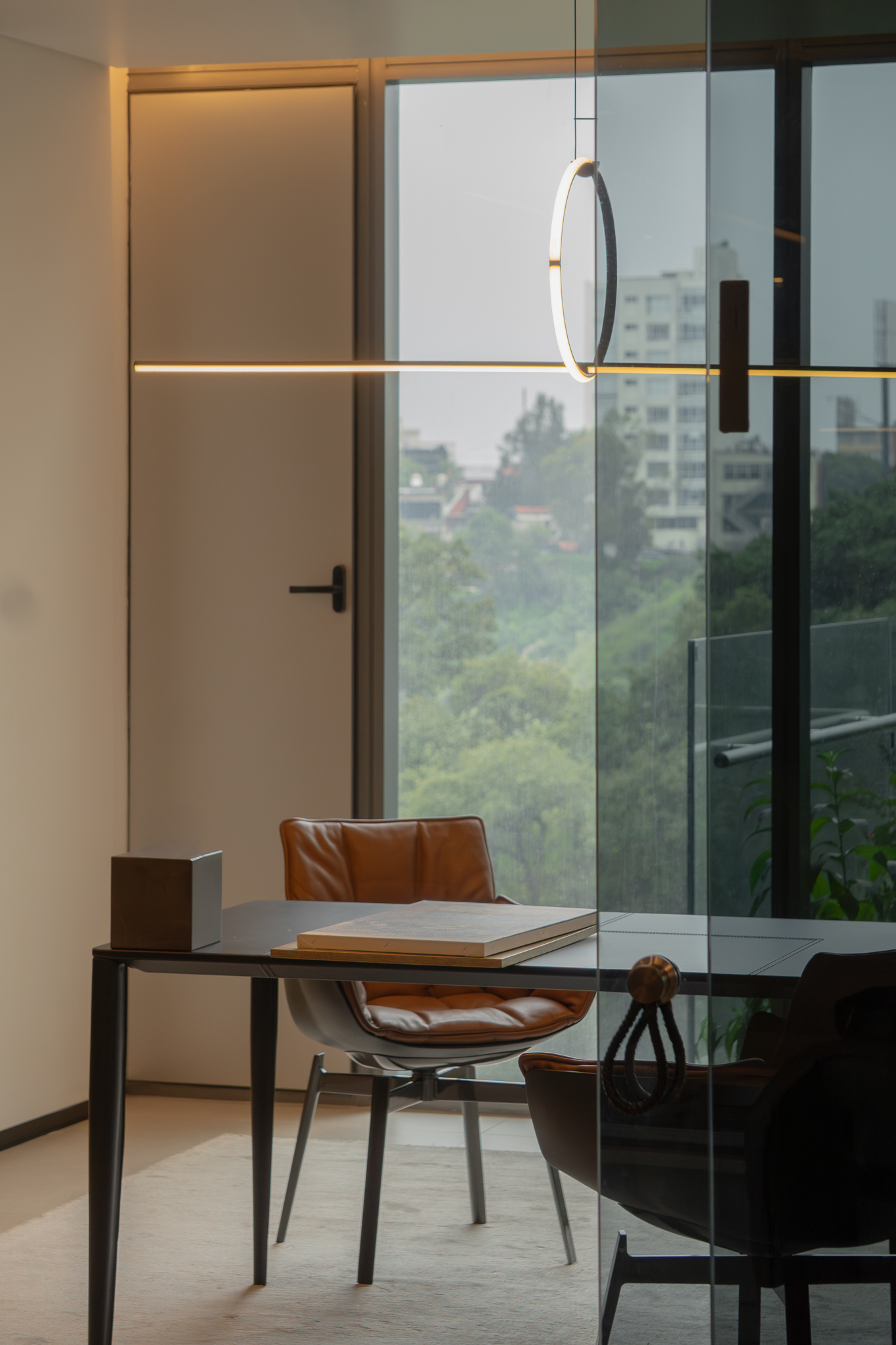 Como elemento funcional y expresivo, el mobiliario se integró a la arquitectura. Destacan la estación de café oculta tras un lambrín de espejo en la sala y un mueble escultórico que funciona como bufetera en el comedor y remate visual desde el área familiar. Las vigas estructurales existentes se aprovecharon para implementar iluminación indirecta que amplía y enmarca los espacios, mientras la selección de obra artística dialoga con la geometría del mobiliario y los elementos arquitectónicos.