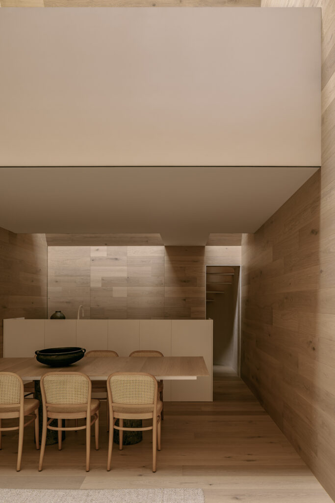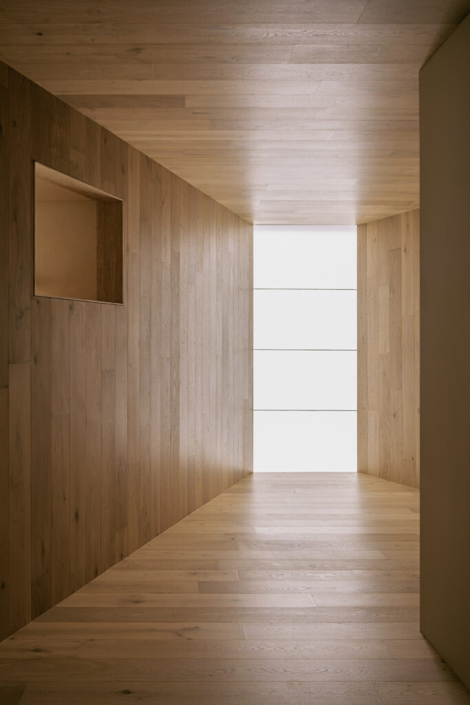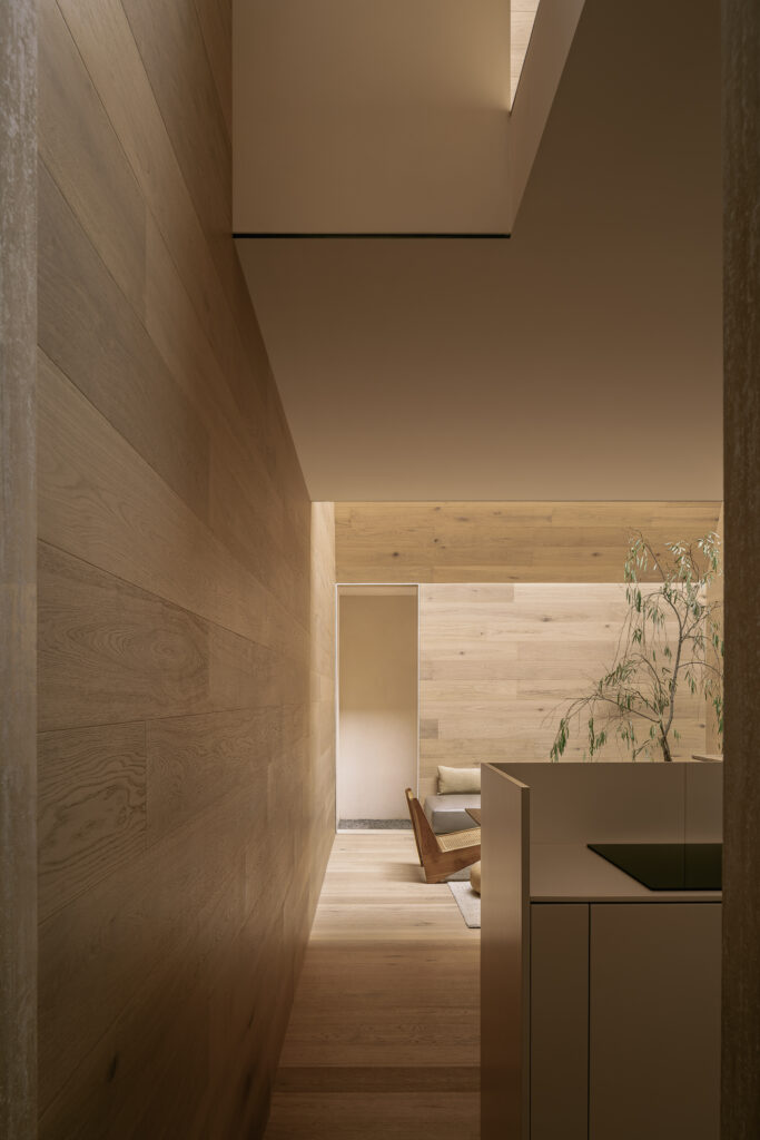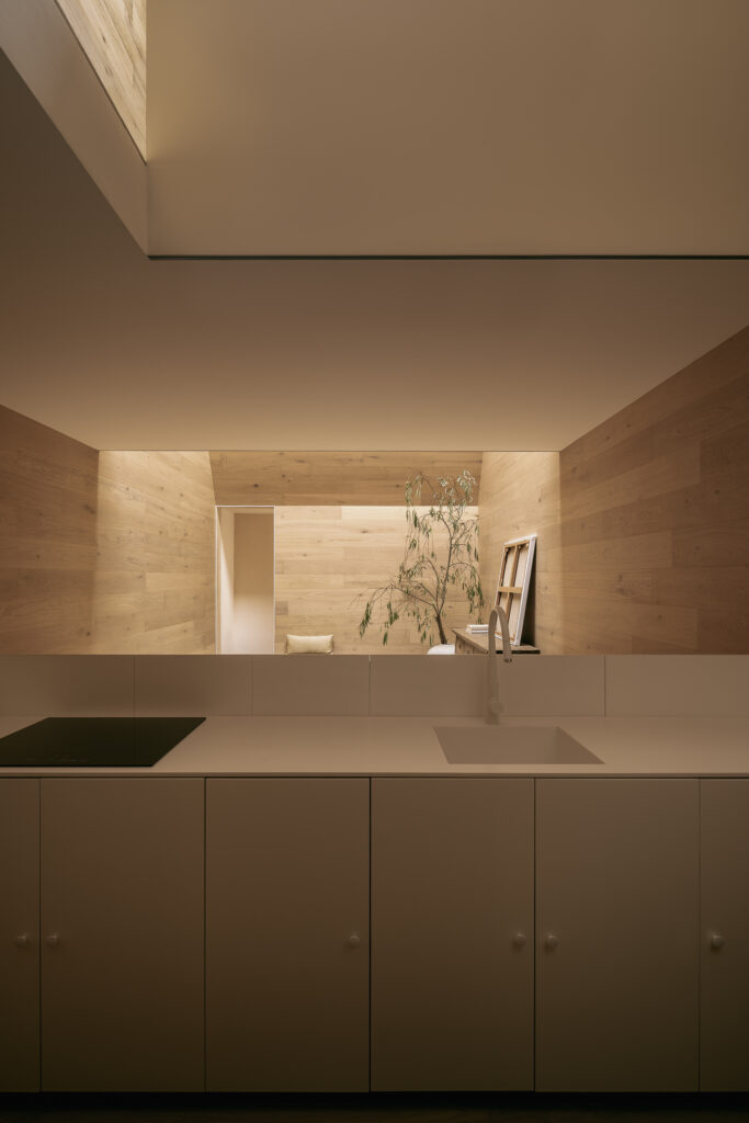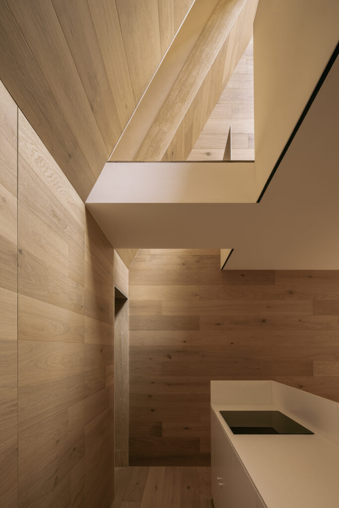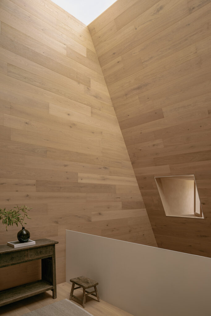 Existen encuentros con la arquitectura que marcan, donde luz y espacio despiertan emociones y transforman la experiencia del habitar. Es bajo esa premisa que Casa Emma, busca transmitir la misma serenidad y calma que el estudio sintió aquel día en Cascáis. A diferencia del museo, aquí la casa se concibe como un ejercicio de excavación: un vacío inspirado en la forma de troje purépecha. Por ello, el interior se resolvió íntegrament en madera, acentuando esta idea y evocando las tradiciones constructivas con respeto y continuidad. La luz, nuevamente, se convierte en protagonista al descender con suavidad y dar vida a los espacios. El terreno, de apenas 4 por 10 metros, exigió resolver iluminación y ventilación de manera cenital y, al mismo tiempo, optimizar cada metro cuadrado.