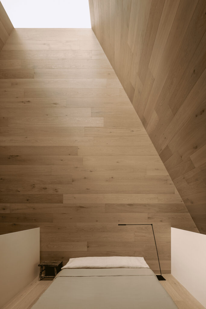Hace algunos años, HW Studio visitó el Museo de Paula Rego, diseñado por Eduardo Souto de Moura. La experiencia fue inmediata: al ingresar, bajo una de sus pirámides, la luz descendía con suavidad por un tragaluz y envolvía el espacio en una atmósfera dorada y serena. Sombras y reflejos danzaban sobre muros y suelos, creando un cobijo contemplativo que los conmovió profundamente.