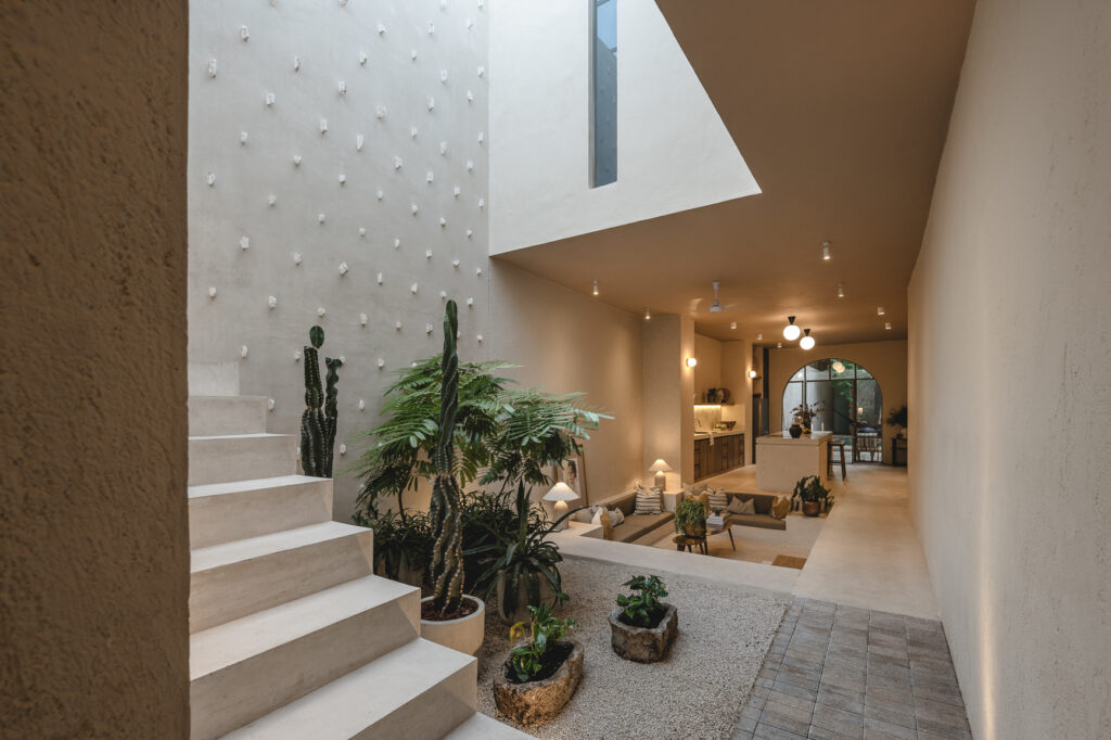 Desde el primer gesto, el proyecto busca rendir homenaje al pasado: se conservó la fachada original como parte del tejido histórico del Centro de Mérida, así como las vigas de madera de la primera crujía, que fueron restauradas e incorporadas al nuevo lenguaje arquitectónico. Para enriquecer la percepción espacial, se hundió la sala algunos escalones por debajo del nivel principal, generando un cambio de altura que aporta intimidad y jerarquía. Esta área se abre hacia un jardín interior, donde un muro de doble altura revestido en rajuela local se convierte en el eje visual y emocional del espacio.