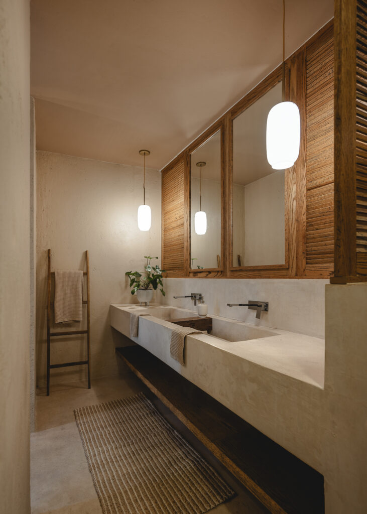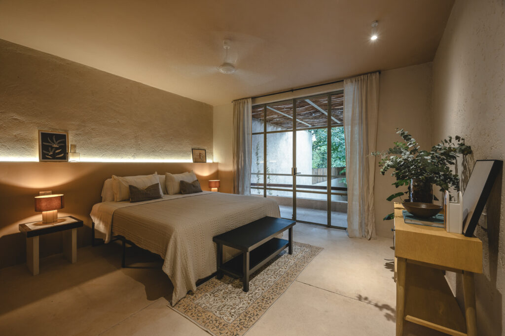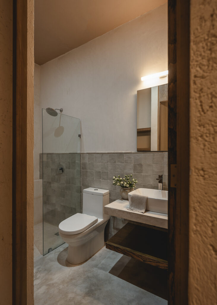 La distribución favorece una conexión fluida entre interior y exterior, con jardines al frente y al fondo que funcionan como extensiones naturales del espacio habitable. A través de vanos estratégicos, se propicia la ventilación cruzada, el juego de sombras y una iluminación natural que acompaña los recorridos a lo largo del día. Los materiales locales –chukum, piedra y madera– no sólo imprimen carácter y autenticidad, sino que establecen un diálogo respetuoso con el contexto. Su uso genera una atmósfera cálida y sobria, donde lo tradicional se mezcla sutilmente con lo contemporáneo. La paleta de colores fue cuidadosamente seleccionada para fundirse con la arquitectura, permitiendo que ésta fuera la verdadera protagonista.