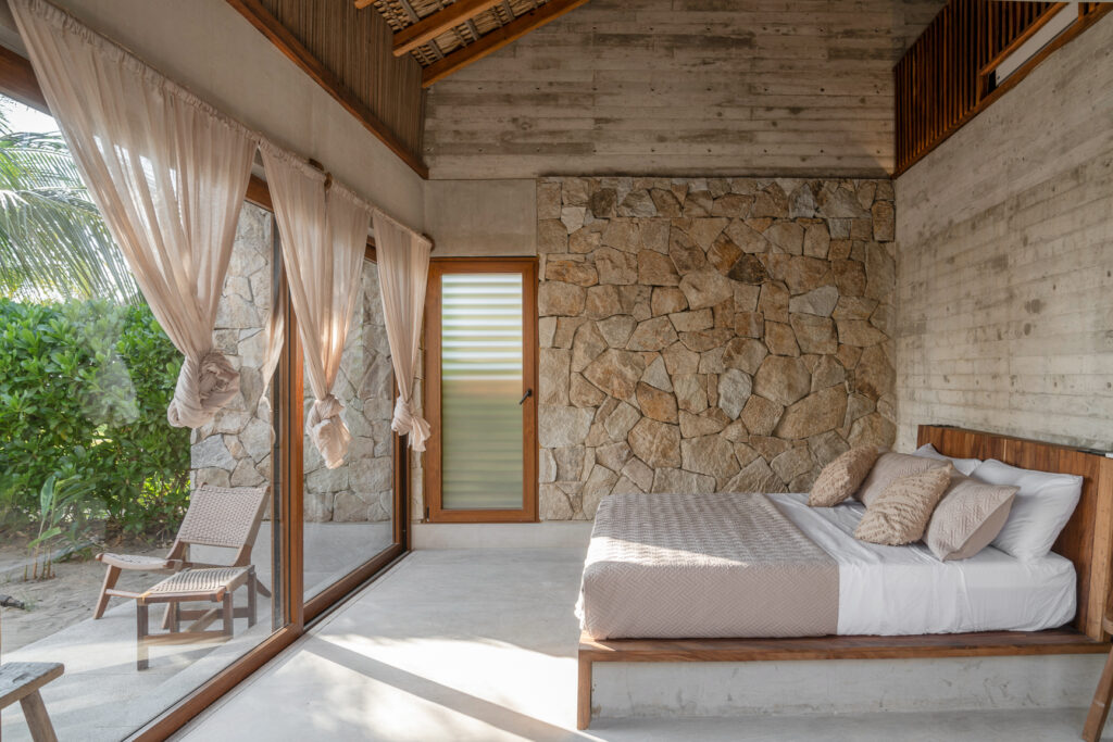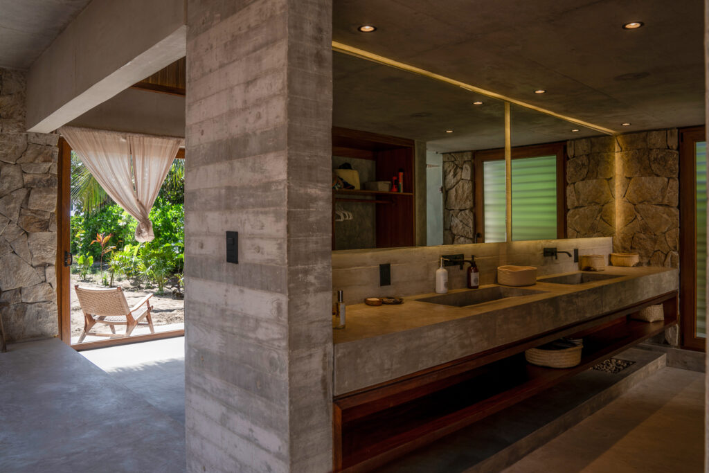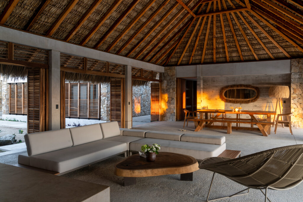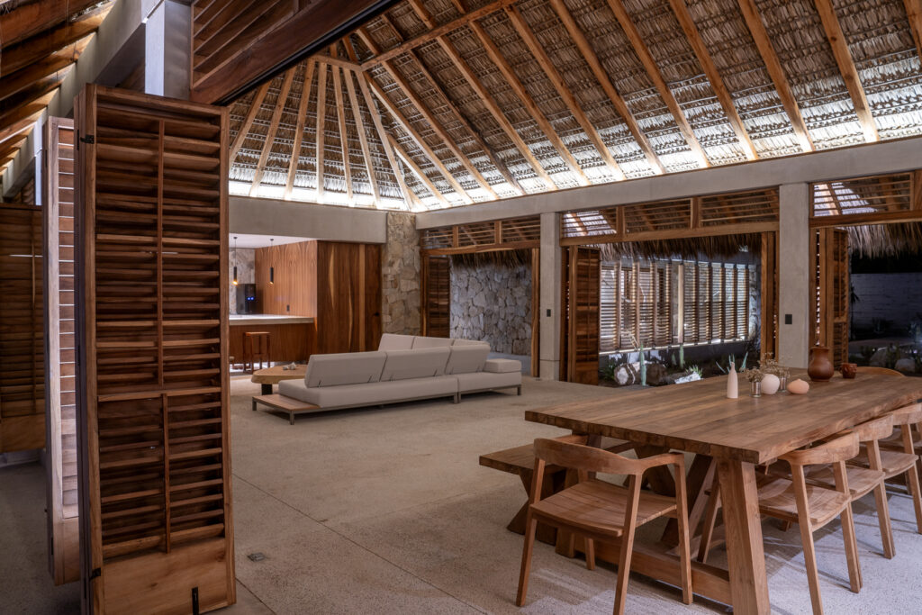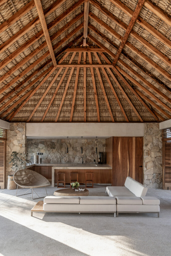 Un testimonio del contexto y de la identidad local que Casa Tate refleja es la selección de materiales: piedra y concreto anclan el proyecto al suelo, mientras madera y palma de las palapas establecen una relación de ligereza y permeabilidad. Esta materialidad surge de la exploración de sistemas constructivos tradicionales y de la colaboración con artesanos locales. Así, la casa logra un lenguaje tectónico expresivo, donde cada ensamble reconoce su propia naturaleza. Los juegos de luz y sombra que transforman los espacios a lo largo del día, potencian la experiencia sensorial. Uno de los mayores desafíos del proyecto fue integrar la arquitectura con el paisaje de una manera natural y sin imposiciones. La solución se encontró en la configuración de pabellones, donde libremente se puede dar recorridos al aire libre y espacios intermedios de transición que transforman la vivencia arquitectónica en una experiencia contemplativa.