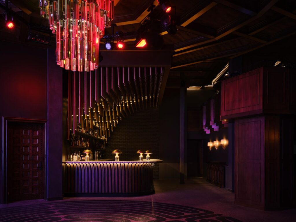 El comedor equilibra la grandiosidad de un salón medieval con la calidez de una velada íntima. Pero el verdadero corazón del castillo se encuentra bajo tierra: una escalera de piedra conduce a un club subterráneo de dos pisos, con escenario, cabina de DJ, pista de baile y un balcón VIP que domina la escena. Aquí, el pasado y la modernidad se funden entre ecos de órgano, texturas de terciopelo y destellos metálicos.