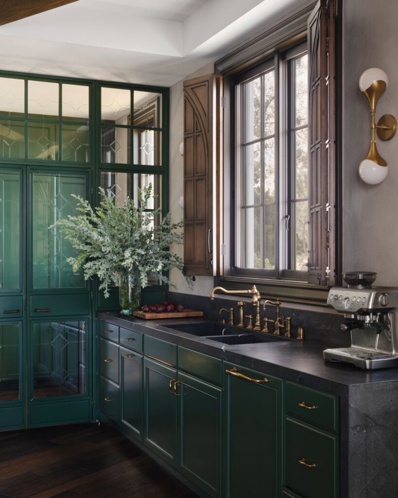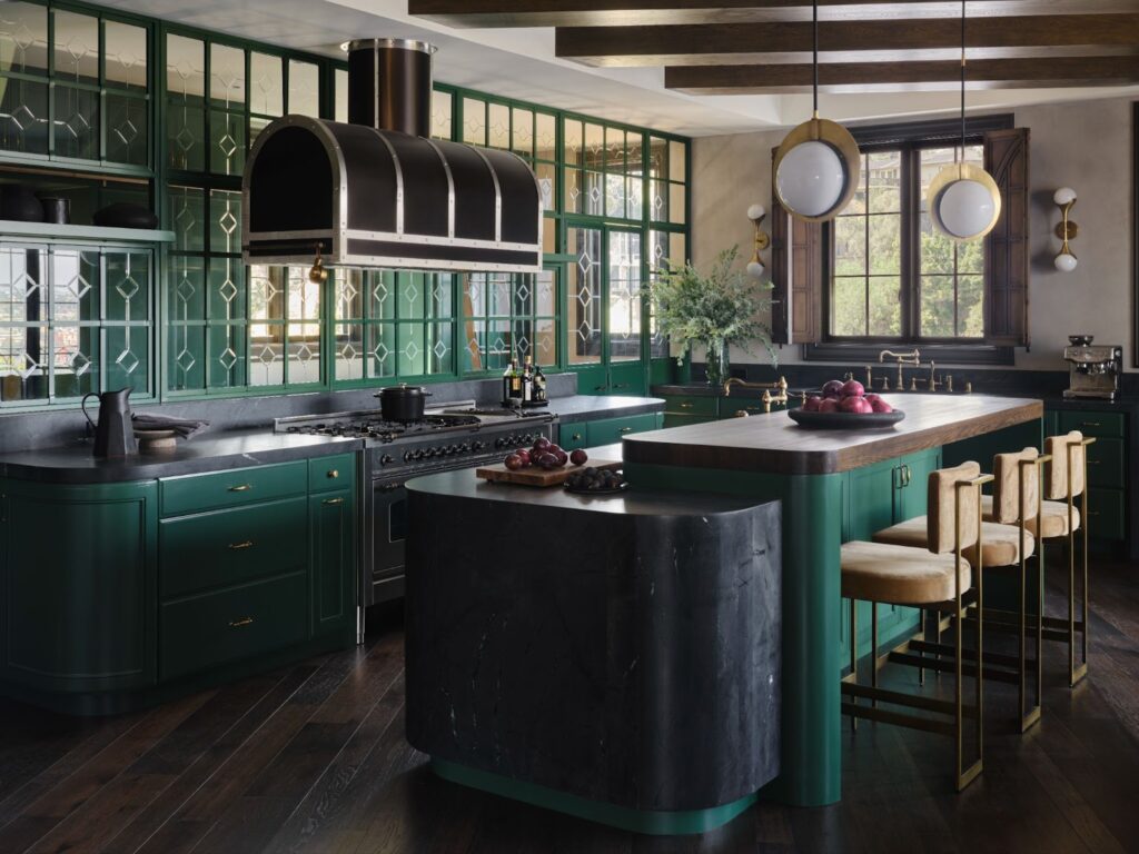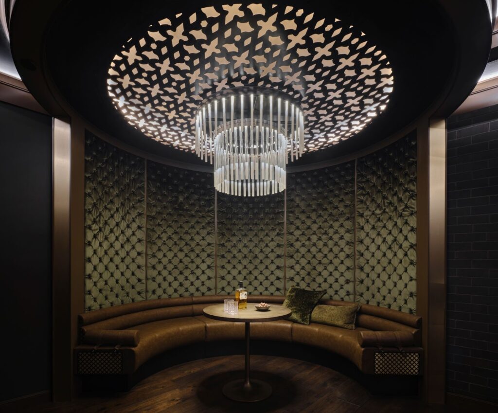 El interior combina materiales nobles —latón, mármol, cuero— con un sentido teatral del diseño. Cada textura remite a la pátina del tiempo, a la melancolía de lo eterno.