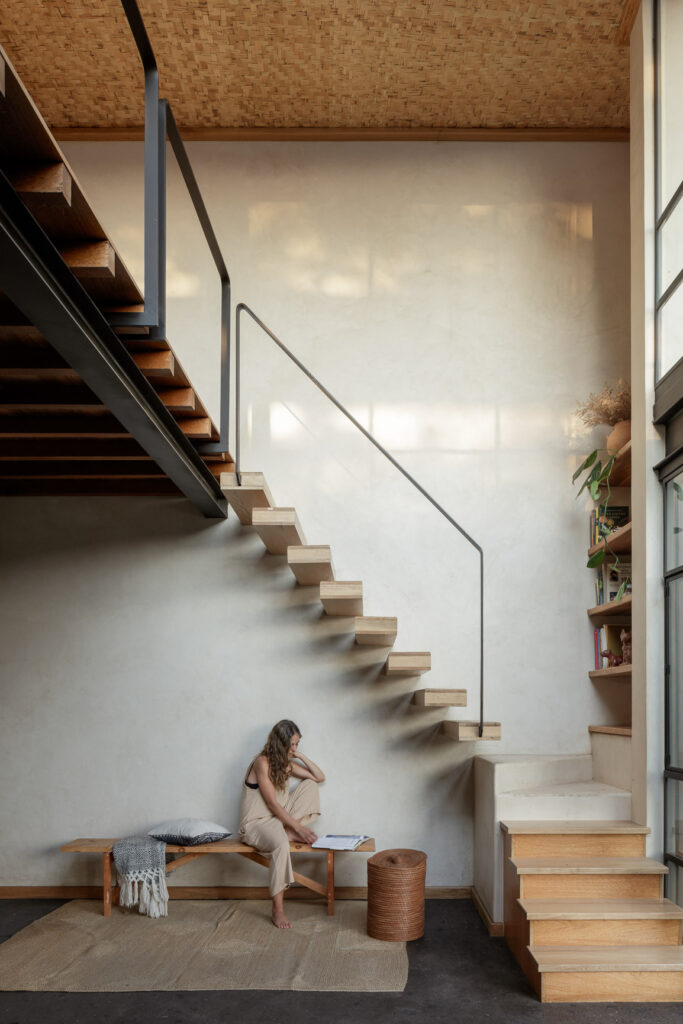 Concebir la casa como un volumen que emerge de la tierra llevó a definir una paleta cruda y honesta, en sintonía con el entorno. Los muros de tapial, elaborados con tierra compactada, recuperan una técnica ancestral de Comala que aporta carácter y calidez a los espacios. Palma, piedra de río, carrizo y herrería artesanal refuerzan el vínculo con la tradición local y reinterpretan la filosofía de Rangel a través de soluciones contemporánea.