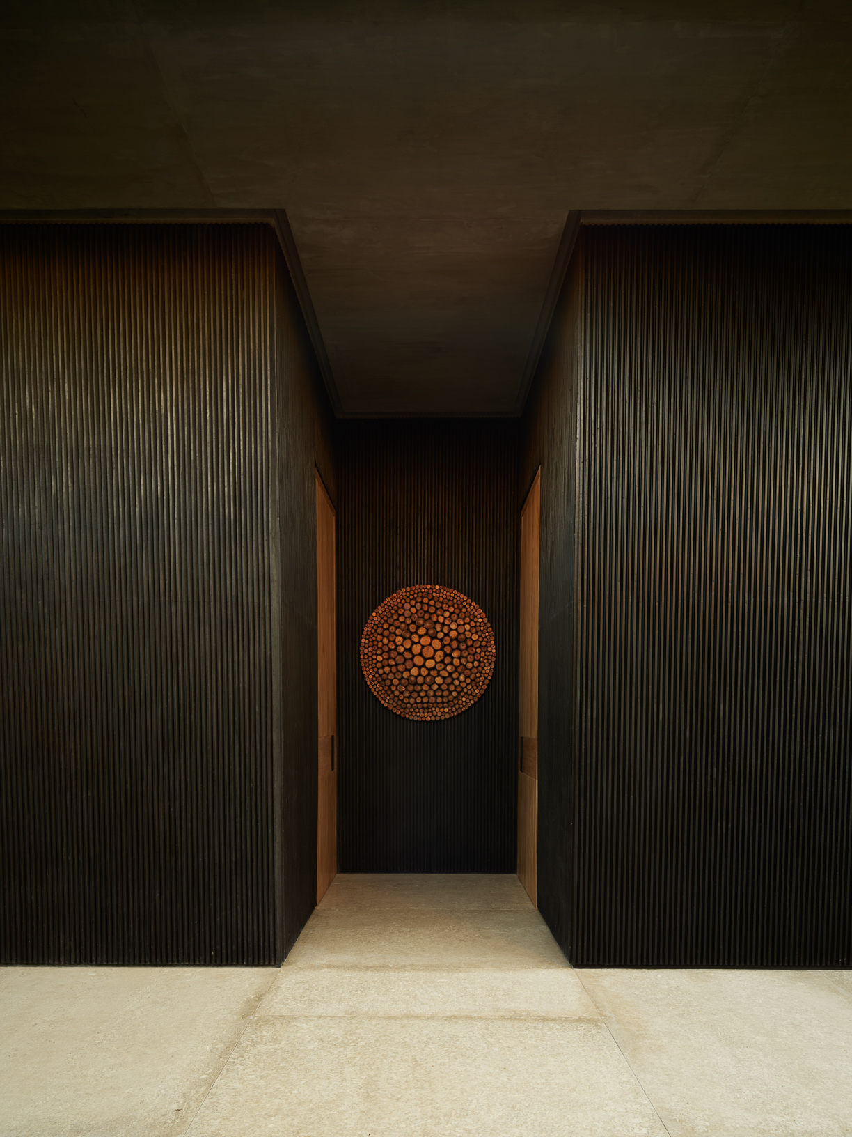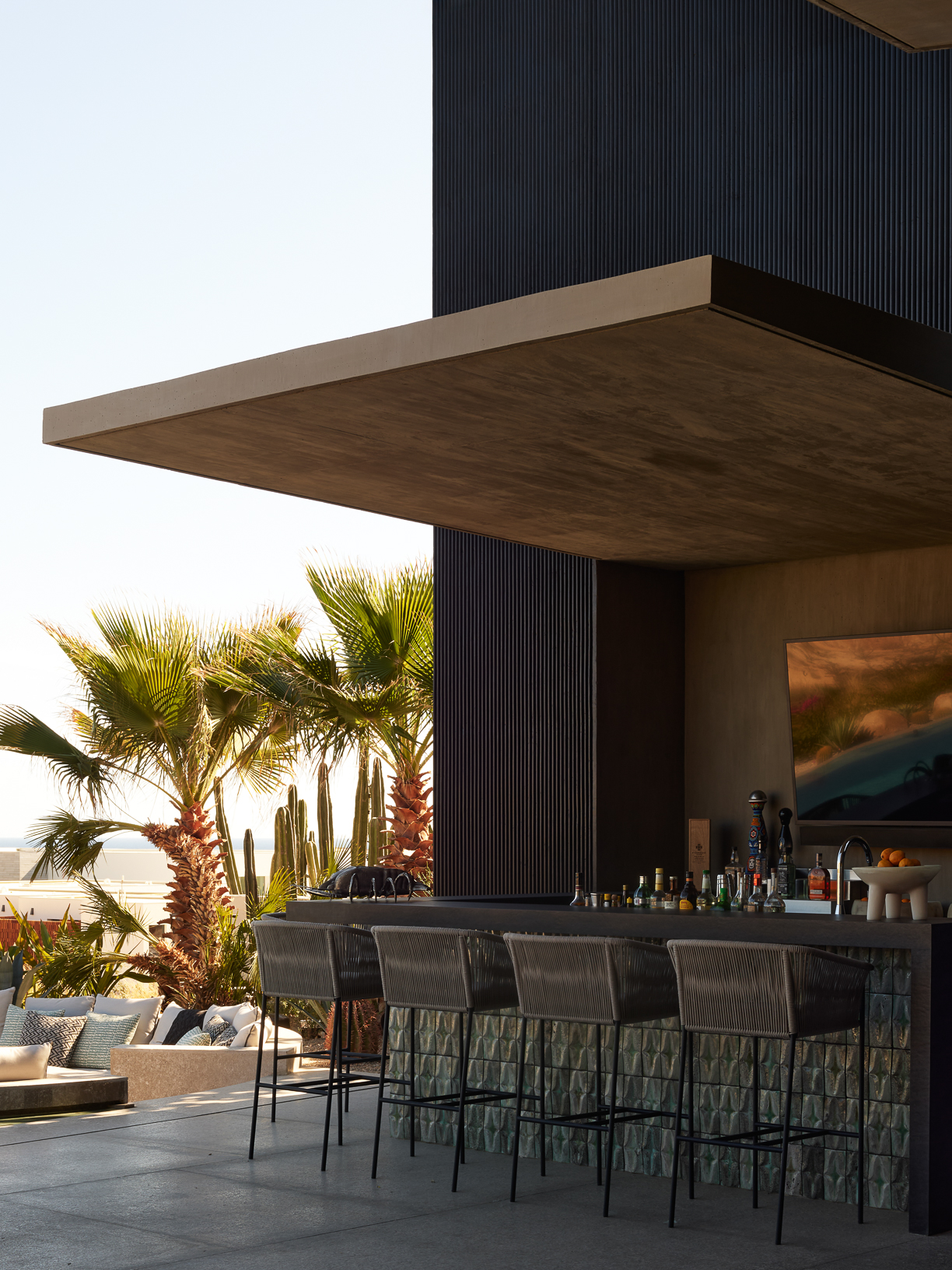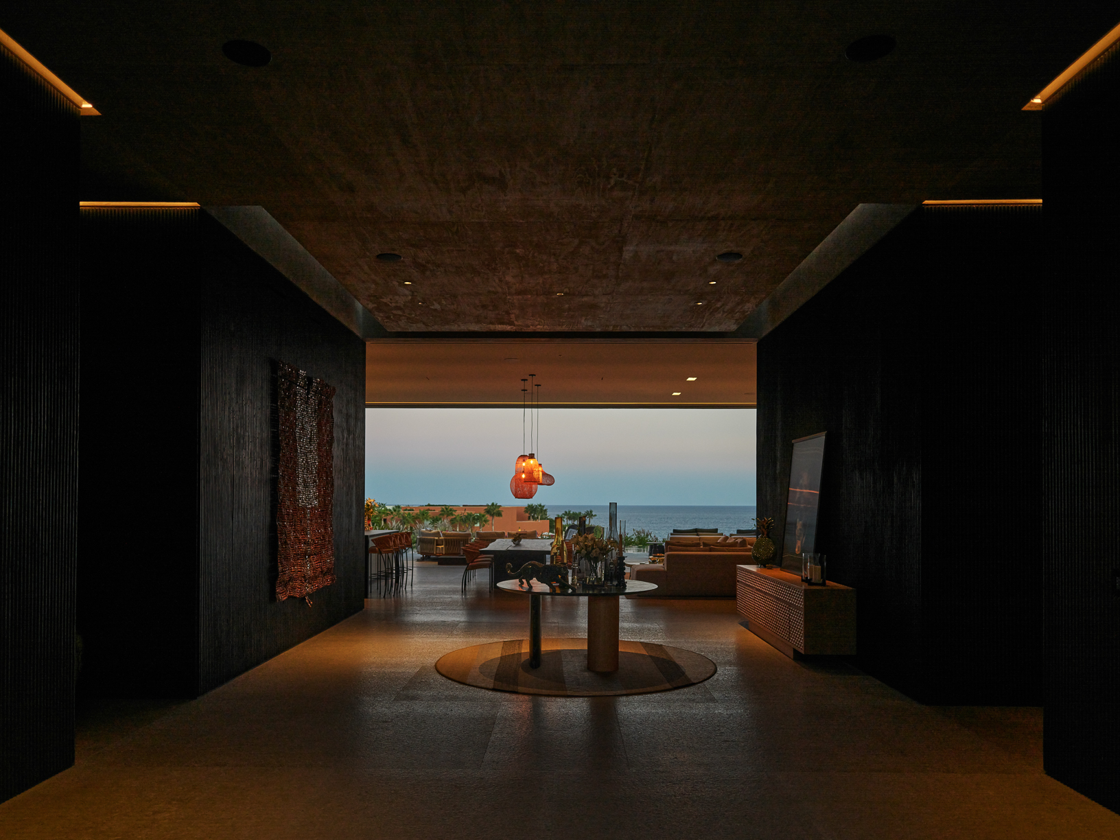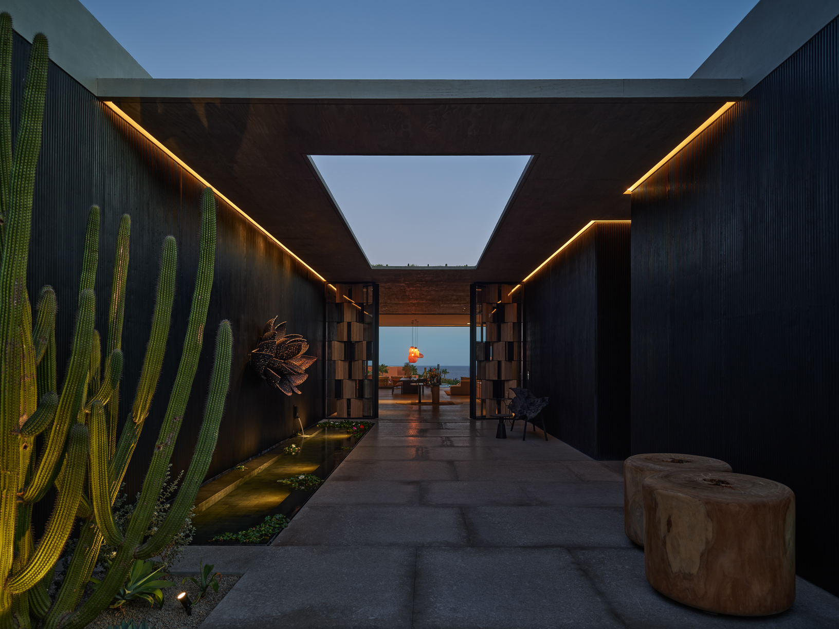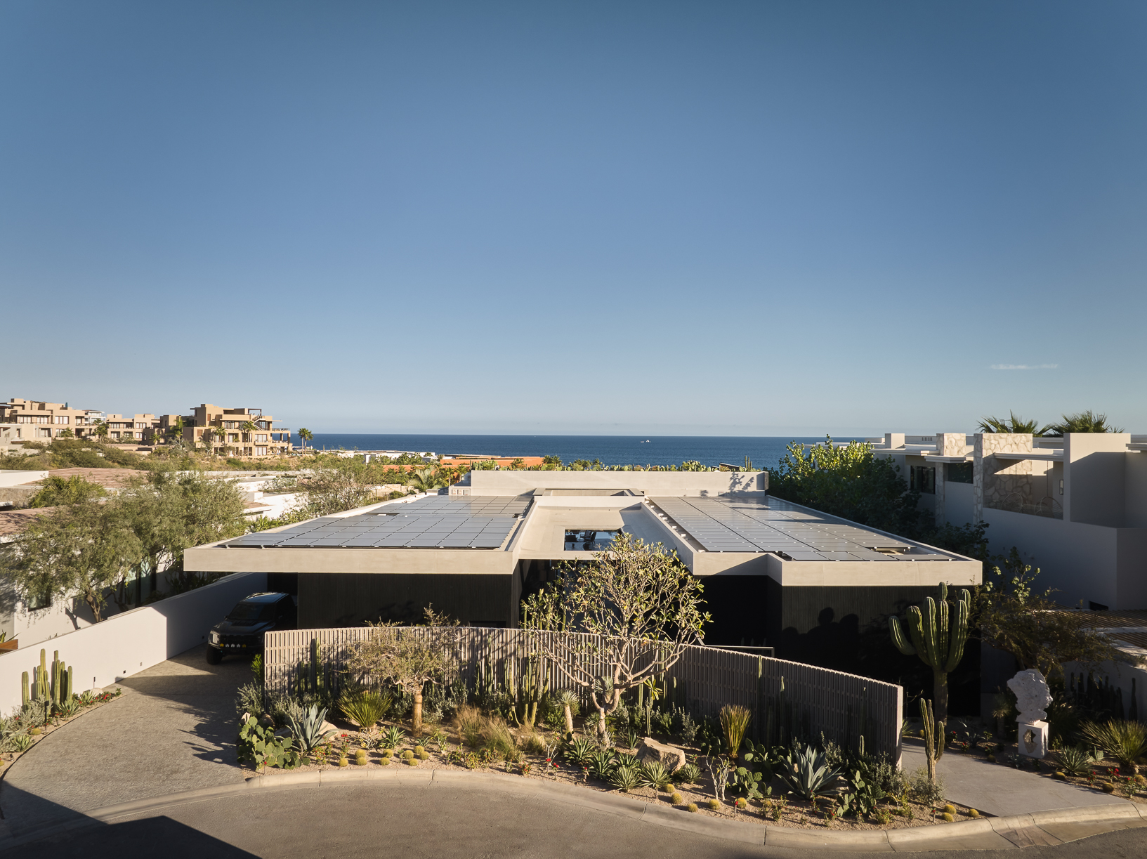Sobre un terreno elevado frente al océano en San José del Cabo, Casa Loto se concibe como una residencia de playa de una sola planta, que invita a la calma y la contemplación. Su estructura parte de una serie de volúmenes —habitaciones de huéspedes, garaje y áreas de servicio— organizados alrededor de un espacio social central que se abre hacia el mar. Una gran losa de concreto descansa sobre el volumen central, brindando a la casa una sensación de orden y organización. El proceso constructivo fue tan relevante como el concepto arquitectónico. Los muros de concreto texturizado y pigmentado en negro actúan como envolvente y límite del gran salón social, mientras que elementos artesanales —celosías, piezas metálicas, mobiliario y arte local— enriquecen la materialidad del conjunto, transformando la casa en una obra donde arquitectura y artesanía se funden. Sobre la losa de concreto se ubica un área con fogata y una terraza de observación que ofrece vistas panorámicas del paisaje de Cabo. En definitiva, la disposición arquitectónica es sencilla en su funcionalidad, pero genera distintas experiencias de descubrimiento a través de patios, jardines y otros elementos naturales, culminando en una vista expansiva del océano.