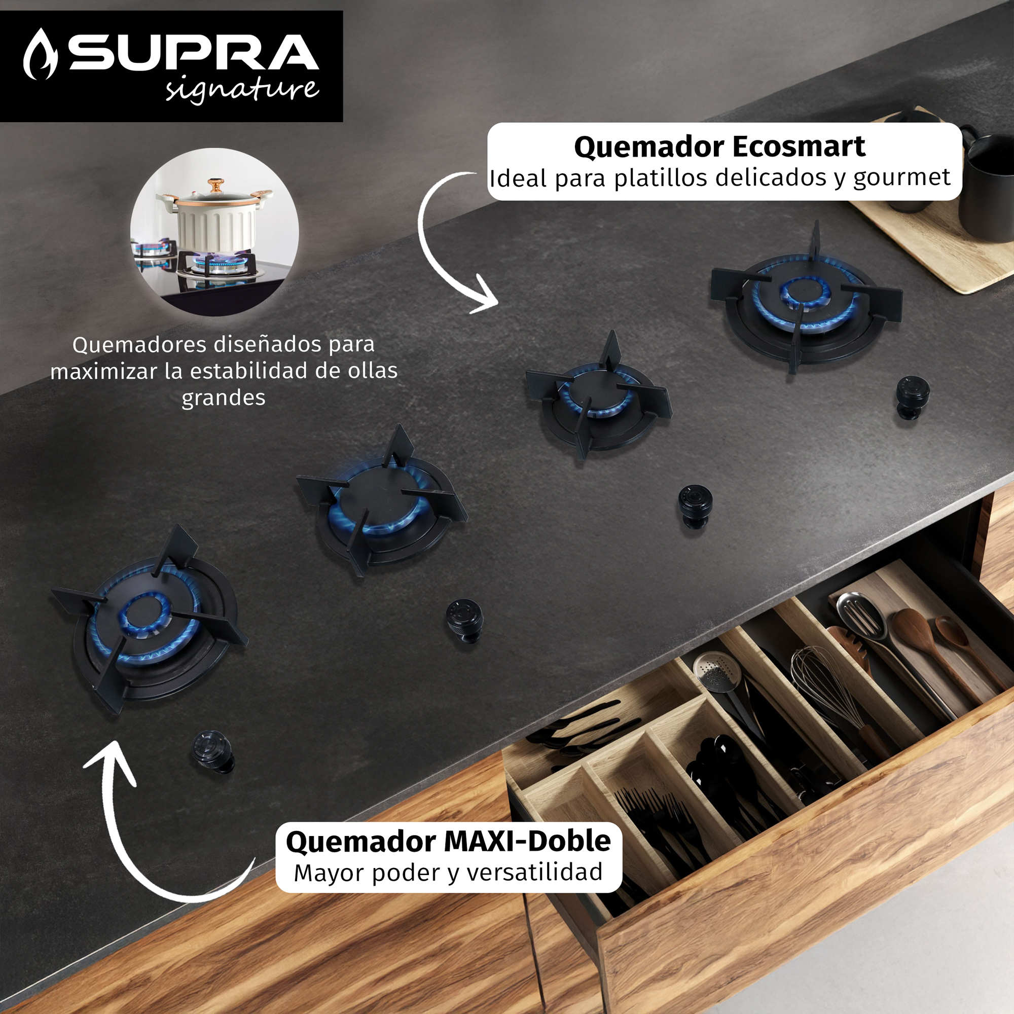 La innovación en cocción no solo responde a criterios estéticos. Sistemas de flama avanzada permiten una distribución uniforme del calor, lo que se traduce en mayor precisión y eficiencia energética. A esto se suman sistemas de seguridad que aportan tranquilidad en el uso diario, integrados de forma discreta al diseño.