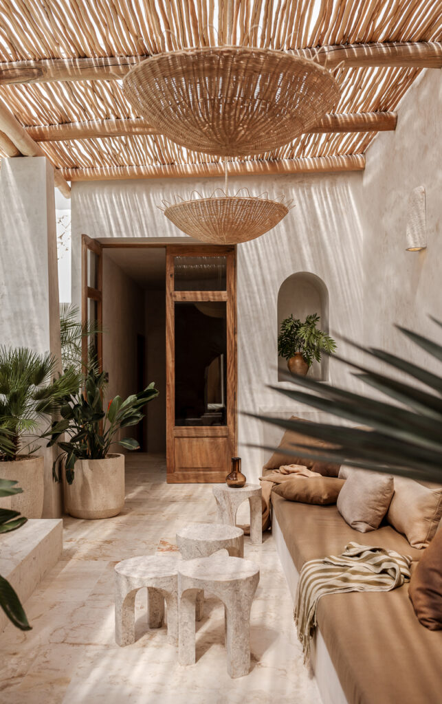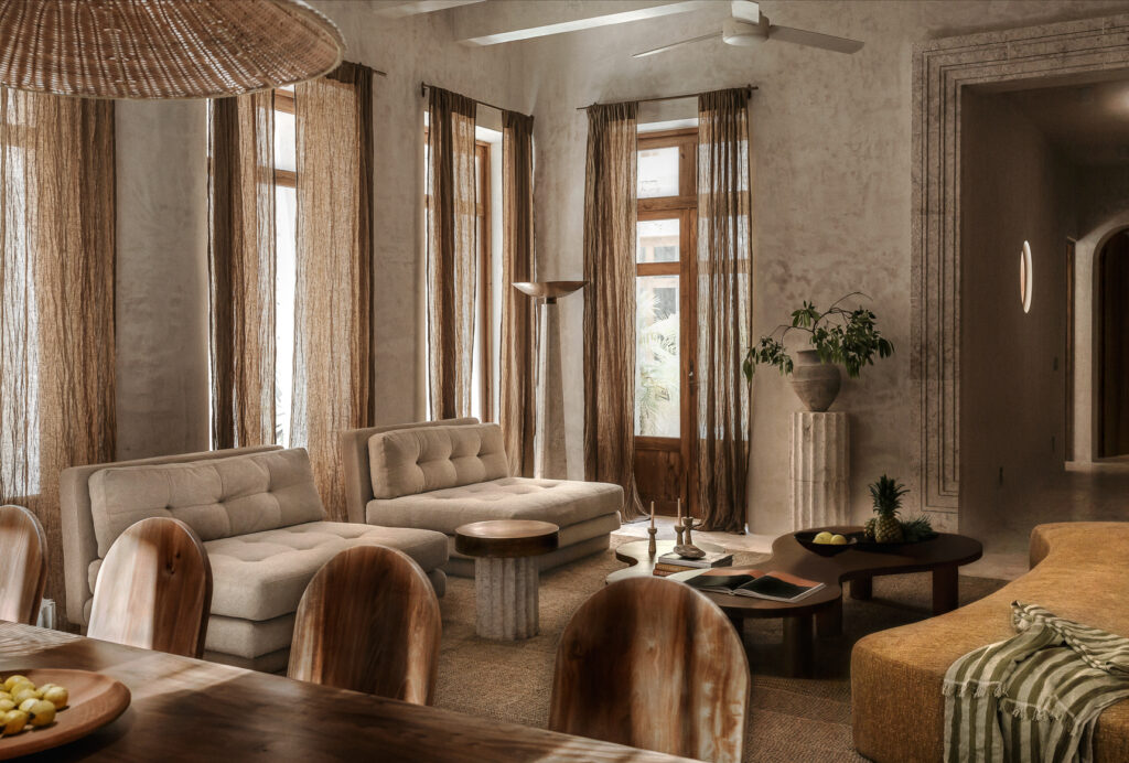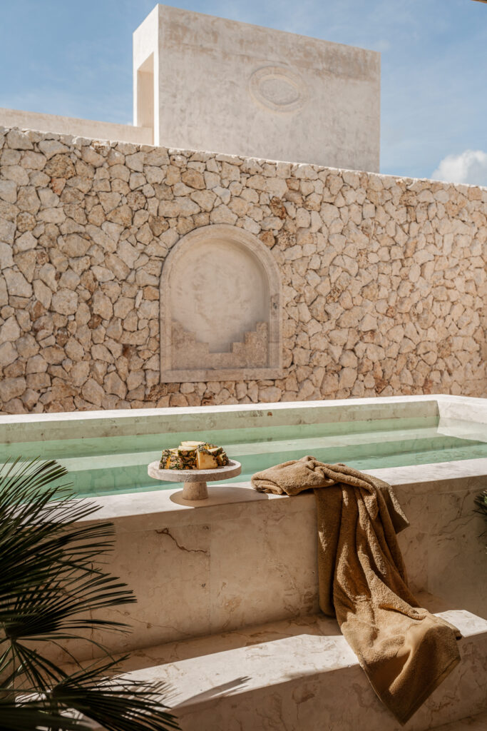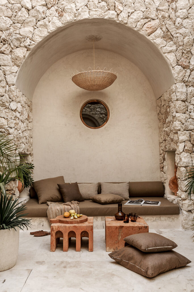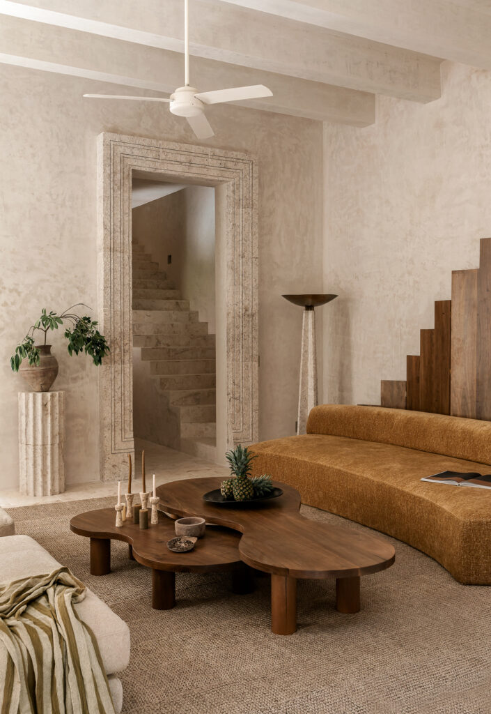 La sala se abre hacia un patio con una pequeña alberca y fuente, enmarcadas por un arco de medio punto en piedra tok, que genera una atmósfera serena. El mobiliario exterior, esculpido en piedra de Ticul, reafirma la conexión con la riqueza geológica del entorno.
