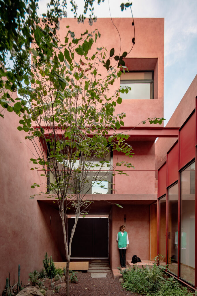 Desplantada sobre un angosto terreno de cinco metros de ancho y veinte metros de fondo, en pleno casco histórico de San Pedro Garza, la vivienda se organiza mediante una columna vertebral de circulaciones y servicios adosados a la colindancia. Un patio central divide el programa en dos volúmenes. El primero, orientado hacia la calle, alberga el zaguán, la cochera, una habitación de huéspedes de doble altura con un tapanco y una terraza en la azotea. El segundo volumen, en la parte posterior se encuentra la sala, el comedor, la cocina, un patio azul que remata el final del sitio y la recámara principal con acceso a una terraza ajardinada. Aunque la planta parte de una secuencia racional de cuadrados, la sección gana dinamismo con escalones, plataformas, traslapes en la cancelería y grecas ornamentadas que culminan en un zigurat rojo. Esta pieza monumental funciona como contención hacia la calle y resuelve la fachada dentro de las restricciones patrimoniales de la zona.