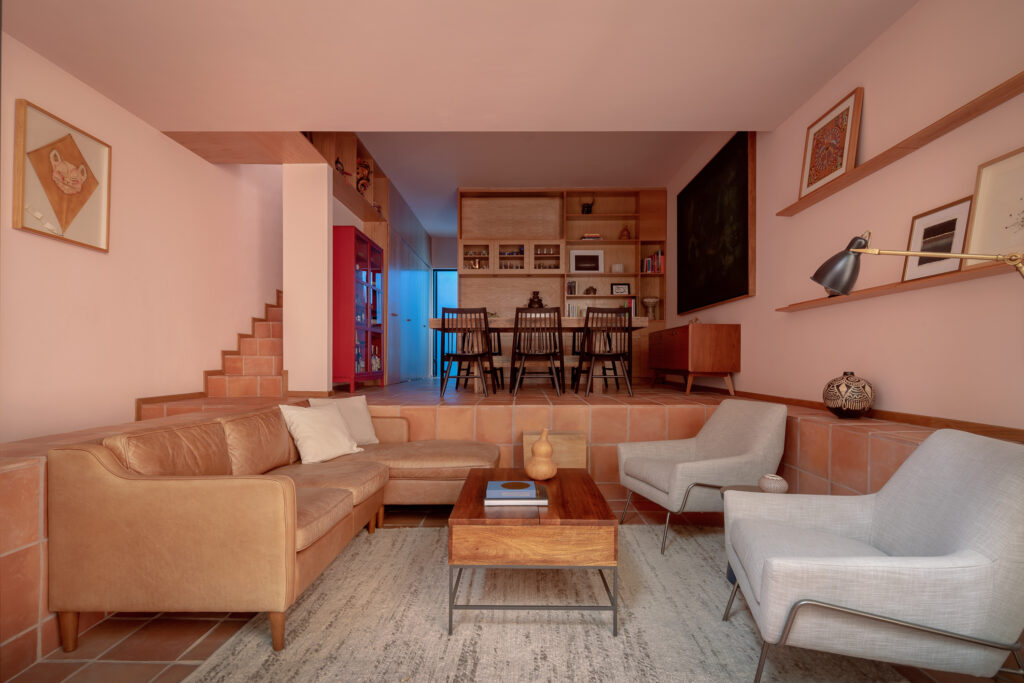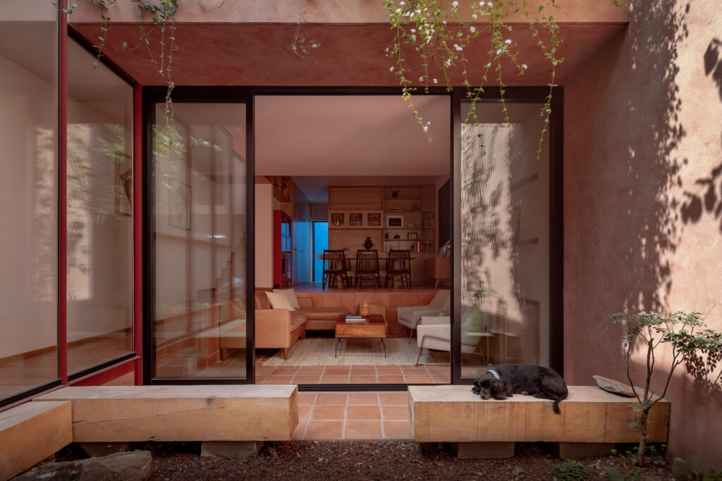 Con vistas de 360° a cerros y sierras, la terraza conecta con el horizonte. En contraste, el interior ofrece atmósferas rojizas y patios ajardinados que invitan a una vida íntima y pausada.