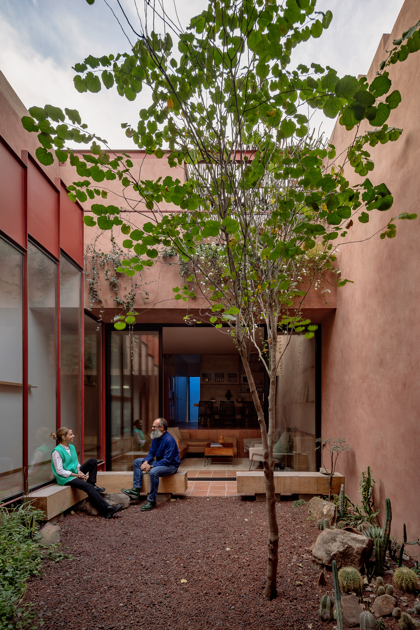 Ederlezi, nombre de la celebración que marca el inicio de la primavera en los Balcanes y Turquía, representa una ruptura con el invierno a través de la música, danza y flores. Esa sensación de renovación y movimiento se traduce en los contrastes que definen el proyecto: el verde exuberante de la vegetación se encuentra con los tonos rojizos de la pasta en los muros, el tezontle que cubre los jardines y la materialidad cálida de los canceles. Esta composición busca perpetuar la energía vibrante de esa estación del año y evoca paisajes desérticos y mediterráneos que surgieron durante las conversaciones con los clientes en el proceso de diseño.
