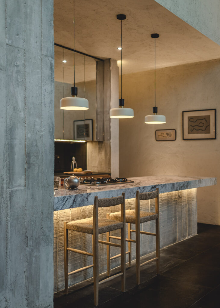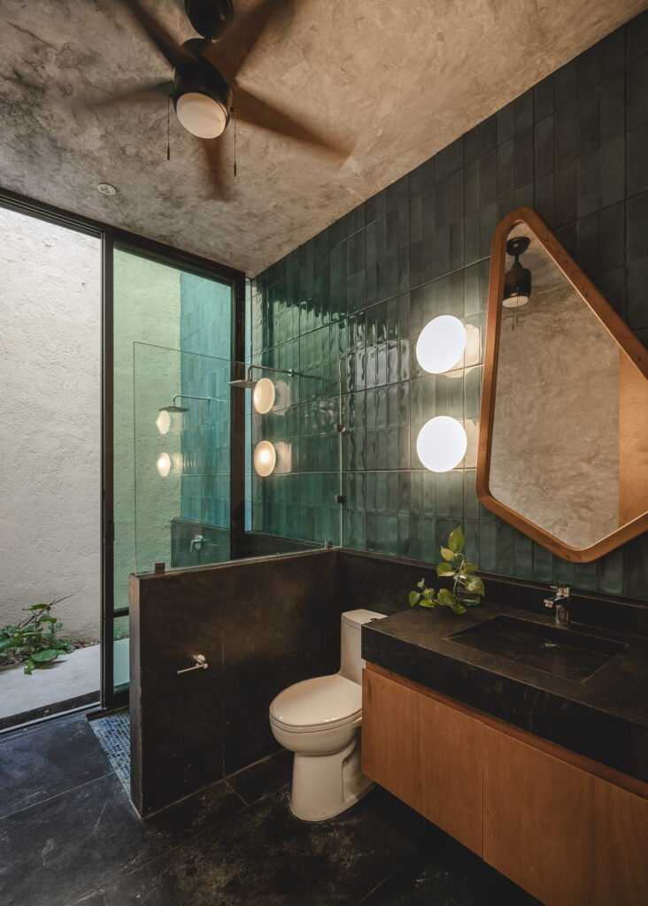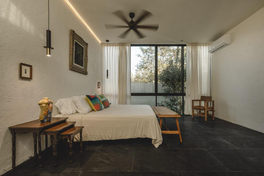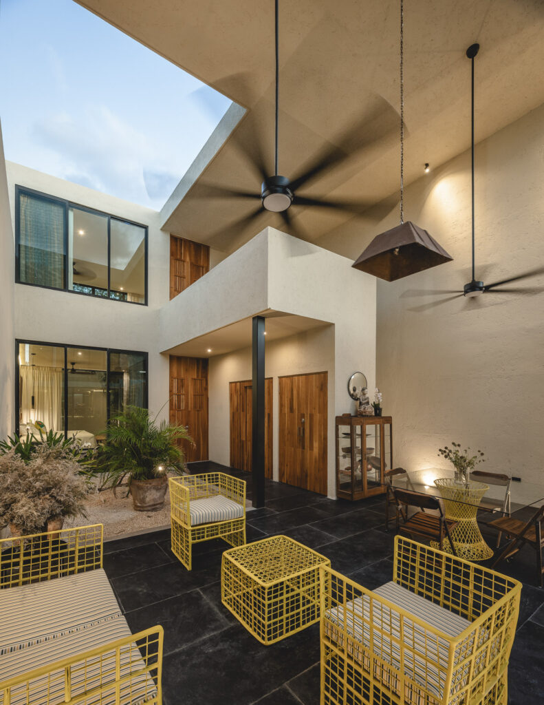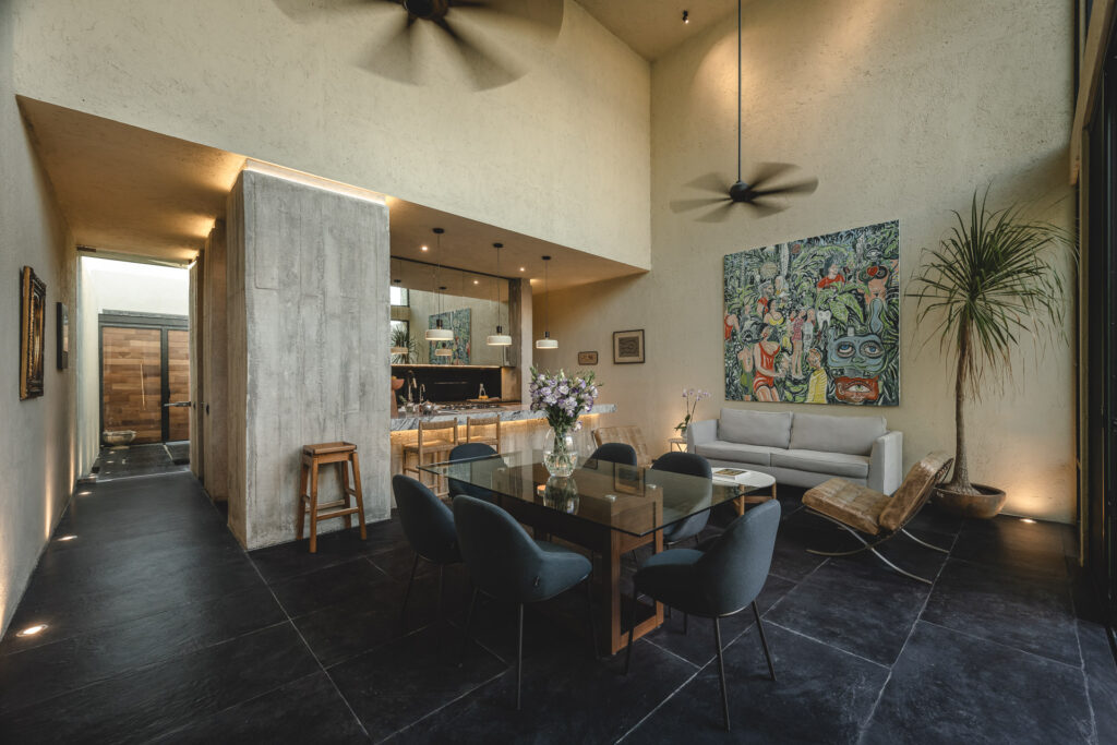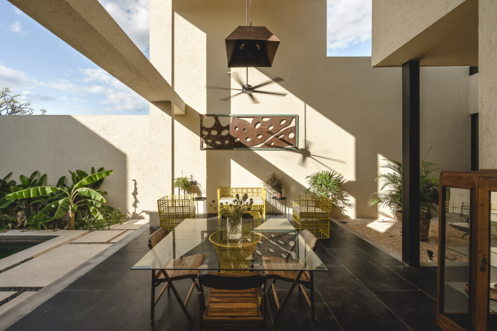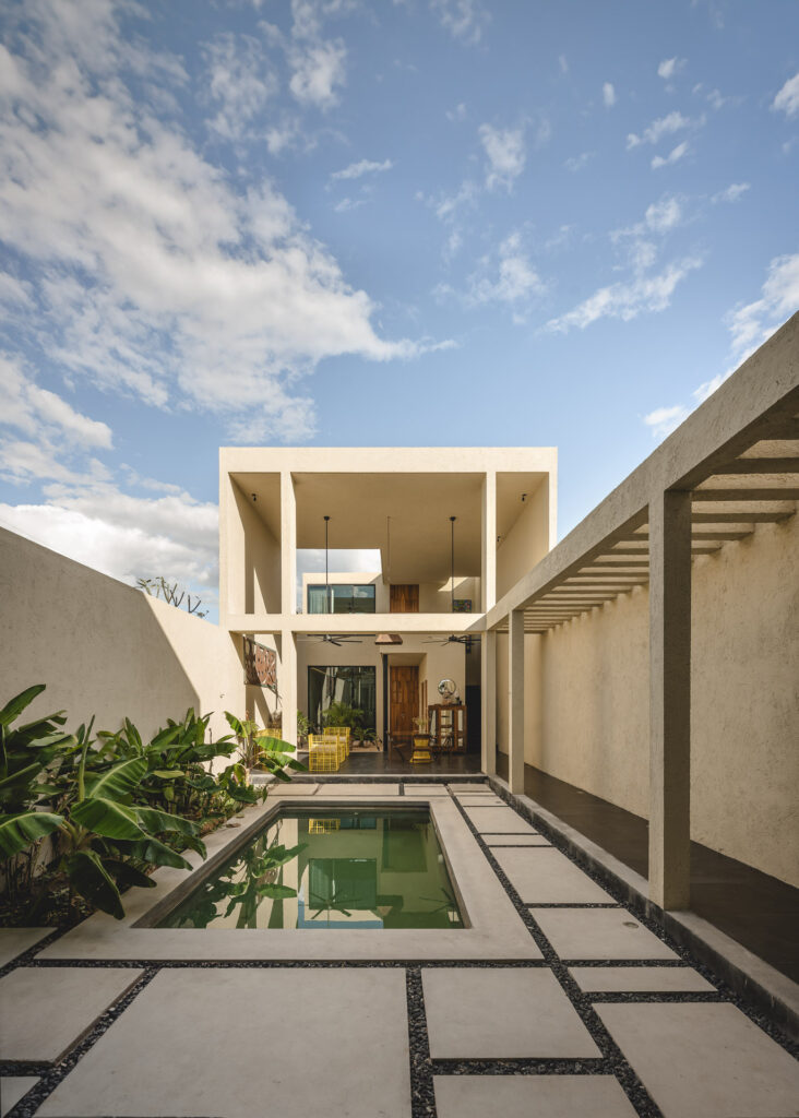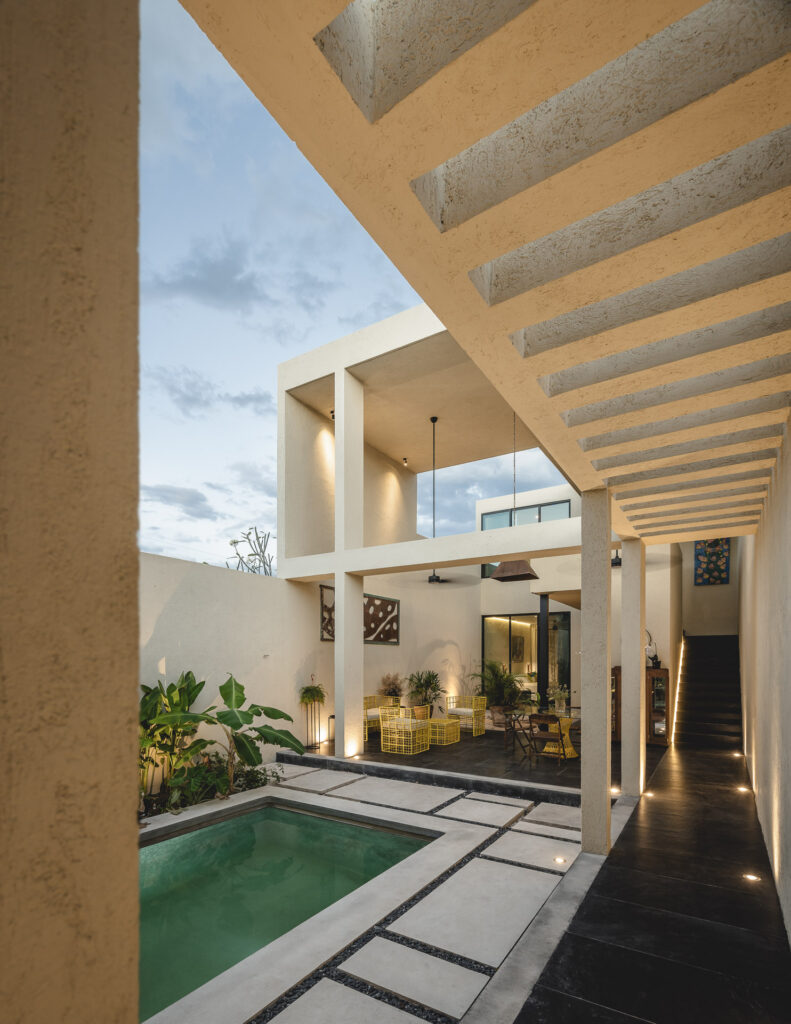 En el interior, los recubrimientos texturizados de muros y plafones reflejan el paso del tiempo y la variación de la luz a lo largo del día, mientras columnas, dinteles y pérgolas conforman espacios que se sienten naturales y vivos. Al interior, muros y plafones tienen un recubrimiento texturizado que permite que los espacios se sientan naturales y vivos, ya que van reflejando el paso del tiempo con la luz que crean distintas dimensiones a lo largo del día; todo esto, en conjunto con los elementos arquitectónicos (columnas, dinteles, pérgolas, etc.). En su sencillez, la casa celebra una experiencia arquitectónica contemporánea fuertemente arraigada al contexto de Yucatán, donde la luz, los espacios al exterior, la calma y la belleza del habitar entre el umbral