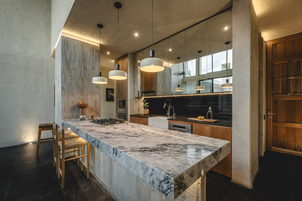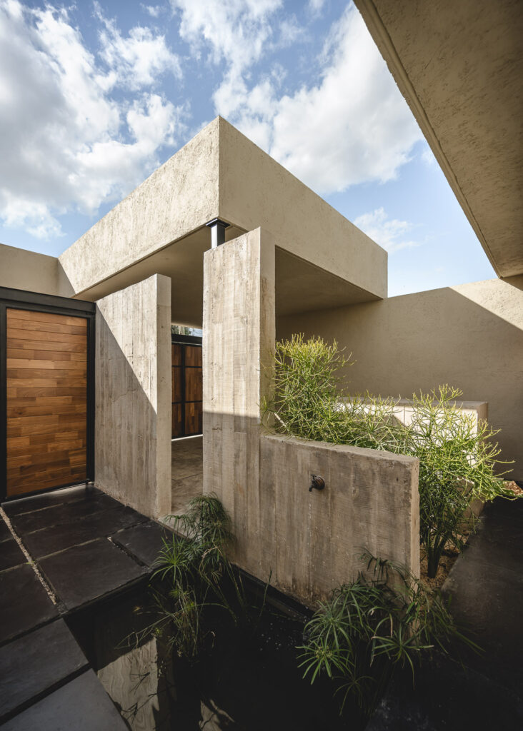 Desde el primer umbral, la arquitectura guía de manera sutil al visitante para dejar el mundo atrás y dar paso hacia la calma. El patio¿ inicial recibe con el sonido del agua, evocando un oasis de paz. Al cruzarlo, un cuerpo de agua funciona como transición simbólica entre el exterior y el interior. Una segunda puerta, transparente, anuncia el acceso definitivo al hogar. La volumetría es sencilla, pero contundente: los espacios de doble altura albergan las áreas sociales, creando la sensación de gran escala donde las actividades pueden desarrollarse con libertad y amplitud, mientras que los espacios privados y de servicios son de una sola altura, lo que da el efecto de confort en el primer caso y de funcionalidad en el segundo. En los muros de acceso y fachadas interiores se utilizó concreto con cimbra aparente, que crea conceptualmente una barrera entre interior y exterior: un hogar protegido por muros que resguardan su propio paraíso interior.