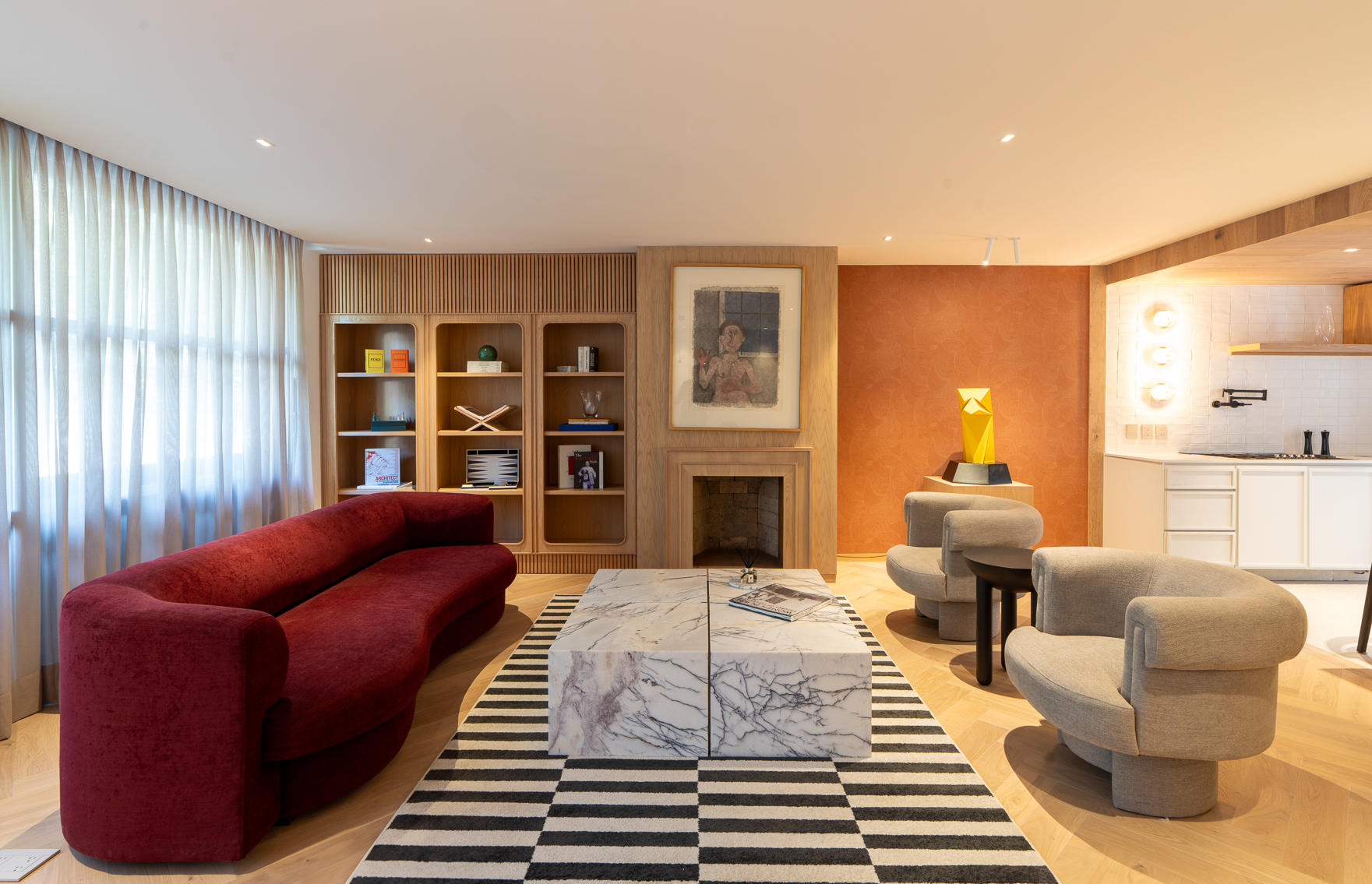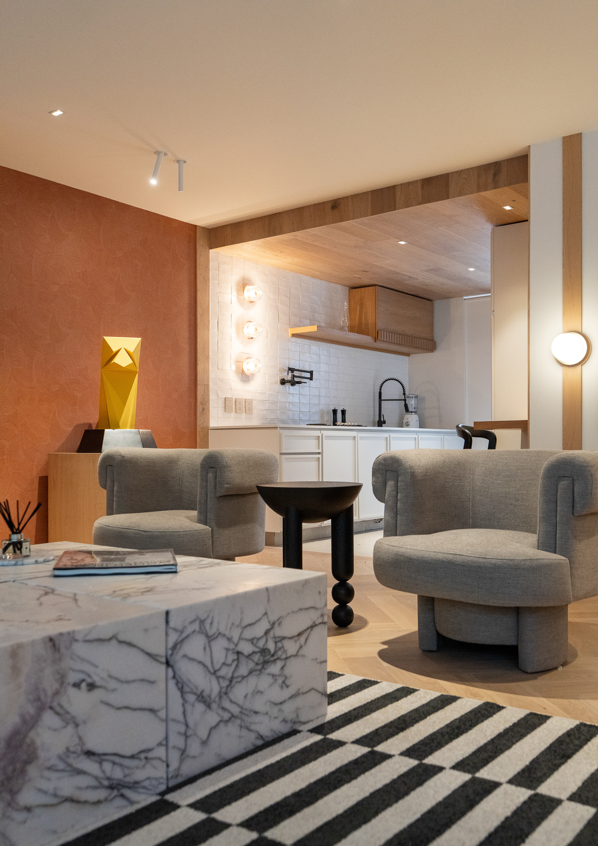 La inspiración provino del diálogo entre texturas naturales y geometrías modernas, evocando el diseño europeo de mediados del siglo XX, reinterpretado con una sensibilidad artesanal mexicana. Esta mezcla se traduce en un ambiente donde el contraste se vuelve armonía: un sofá sinuoso en terciopelo rojo se enfrenta a la precisión geométrica de una mesa de mármol, mientras una alfombra de patrones gráficos ancla la composición con equilibrio visual.