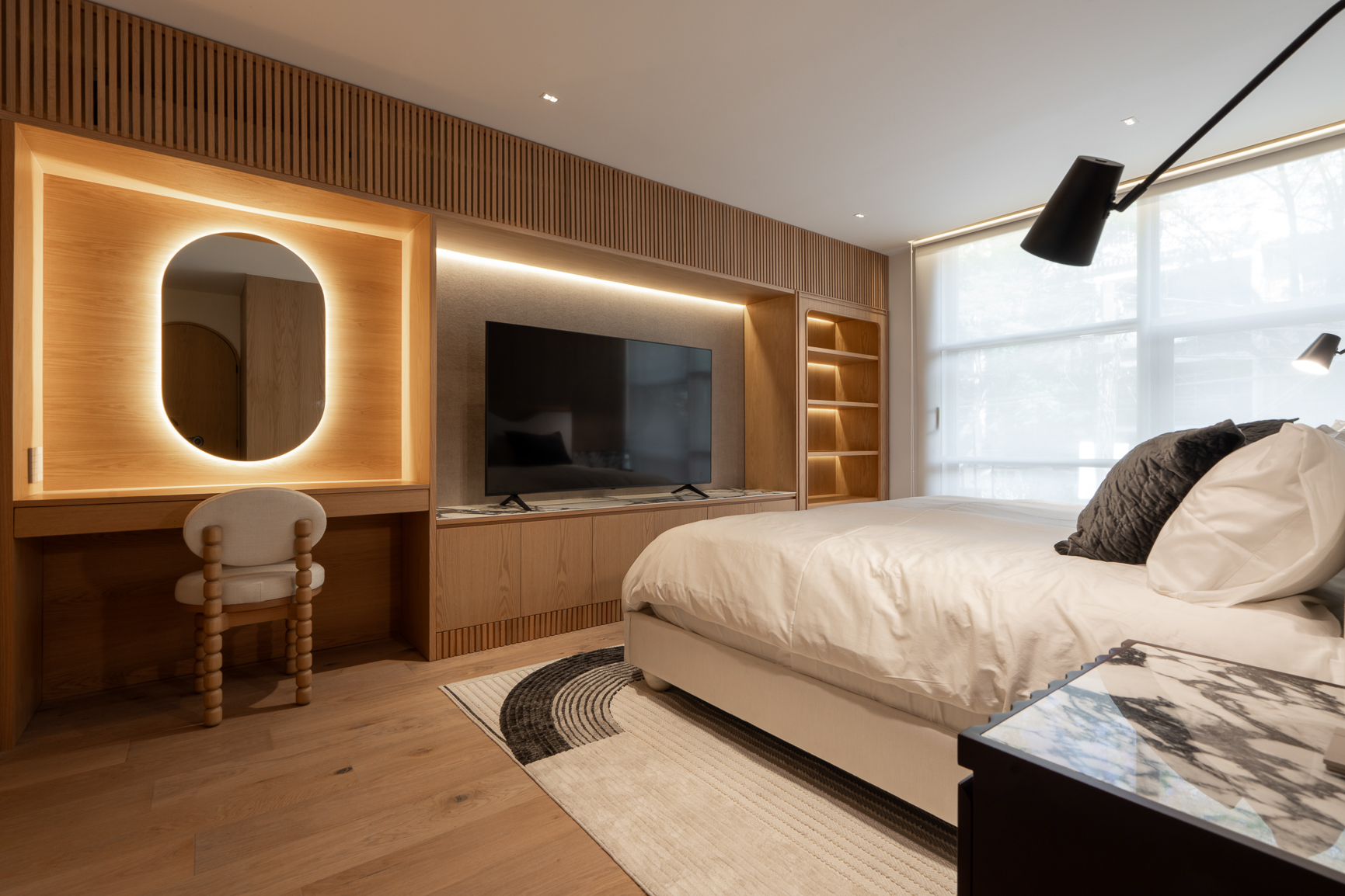 La remodelación del departamento apostó por una atmósfera acogedora, íntima y elegante. El cliente buscaba funcionalidad sin renunciar a una fuerte carga estética, y el resultado fue una narrativa espacial que fluye con naturalidad entre lo estructural y lo curvilíneo.
