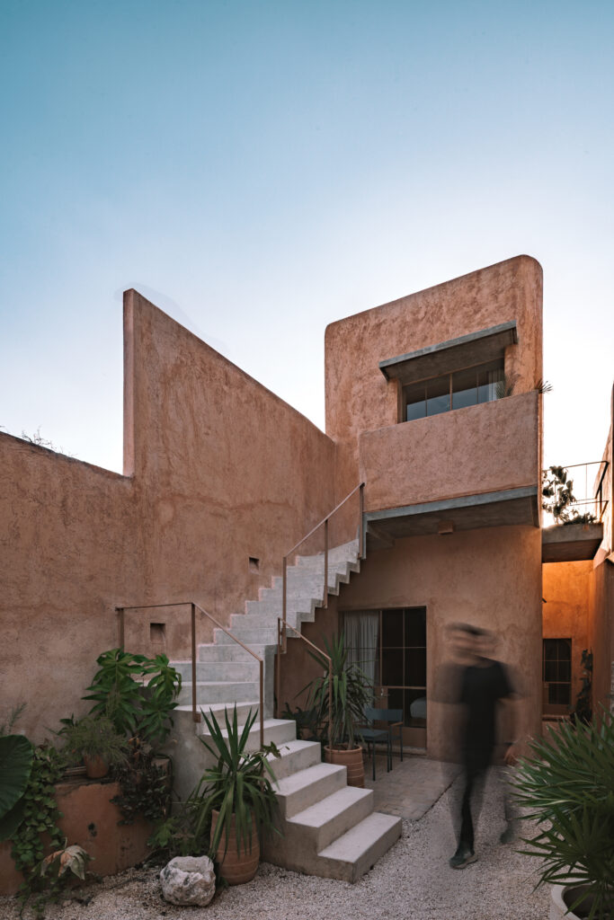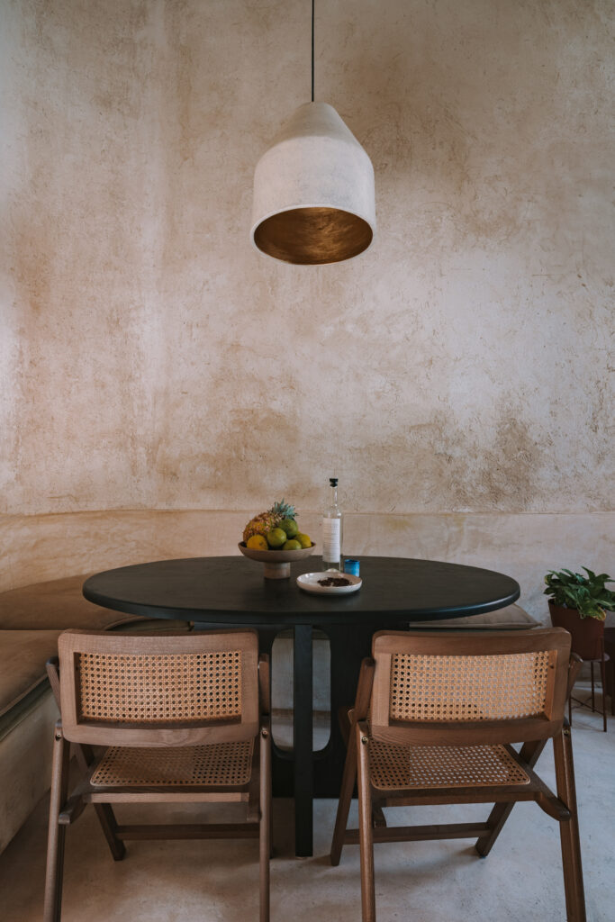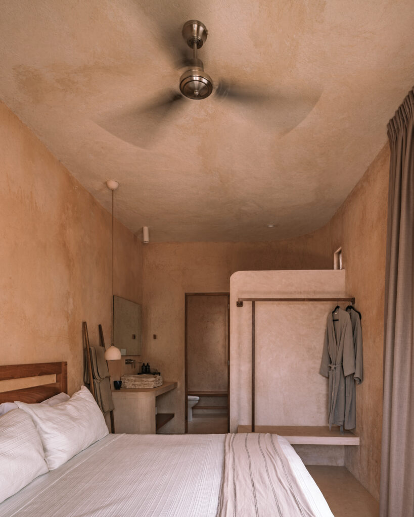 La elección de materiales establece un diálogo directo con el entorno, desde los muros exteriores emparchados con tierra de la región, cuyo tono naranja-terroso define el volumen, hasta la carpintería y el mobiliario fijo en cedro macizo, que prolongan esa conexión hacia el interior con calidez y textura, todo ello contenido en una paleta sobria y esencial, libre de ornamentos superfluos y sustentada en la fuerza expresiva de la materia misma.